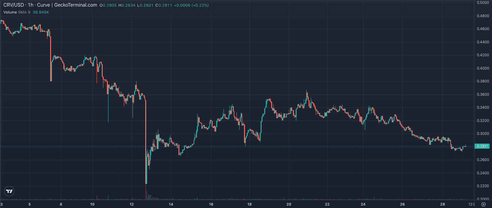 See below the sharp drop in the CRV/USD pair on June 12, bringing CRV down to a price of ~$0.20 before recovering somewhat.