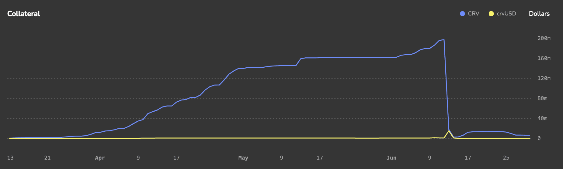 At its peak, there was $55m of debt in the market, with the collateralization coming under threat on June 12 when a declining CRV price began a liquidation cascade that wiped out a major position in the market.