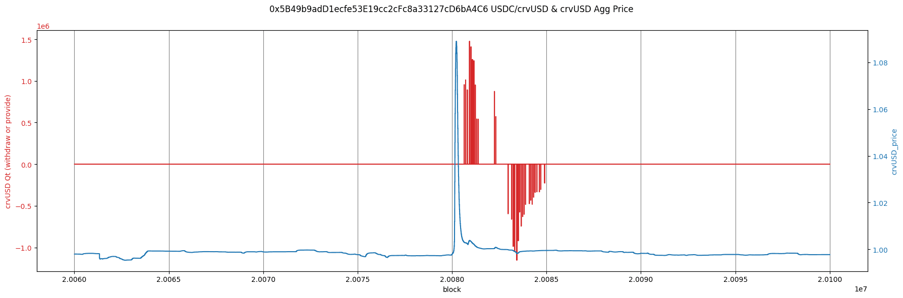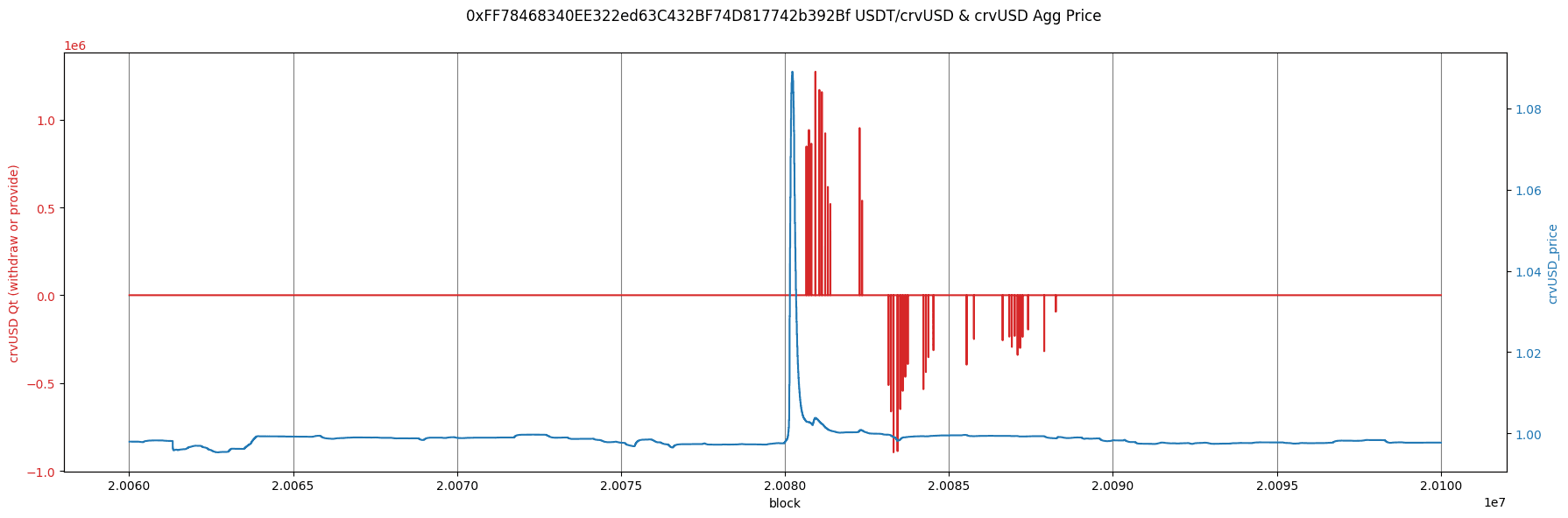 Below we show an analysis of when the PKs were active and were providing and withdrawing around the incident. We highlight three pools overlaid with the crvUSD price spike to show the delay between the spike and successful supply by the Pegkeepers.