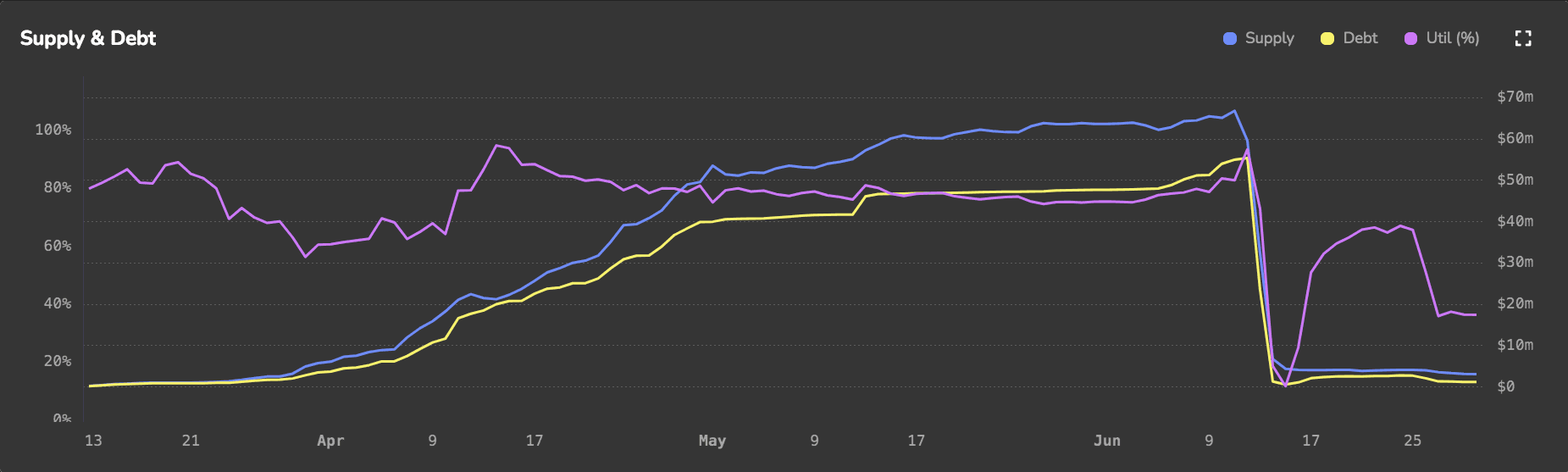 The falling CRV price made the position vulnerable to liquidation and eventually, the position was liquidated. Shown below is a more focused look at the debt vs collateral value supplied to the market over time. Observe the phase where total debt and total assets are almost equal. Both the debt and collateral asset value decreased, which can be inferred as lenders taking their crvUSD out amid the crisis.