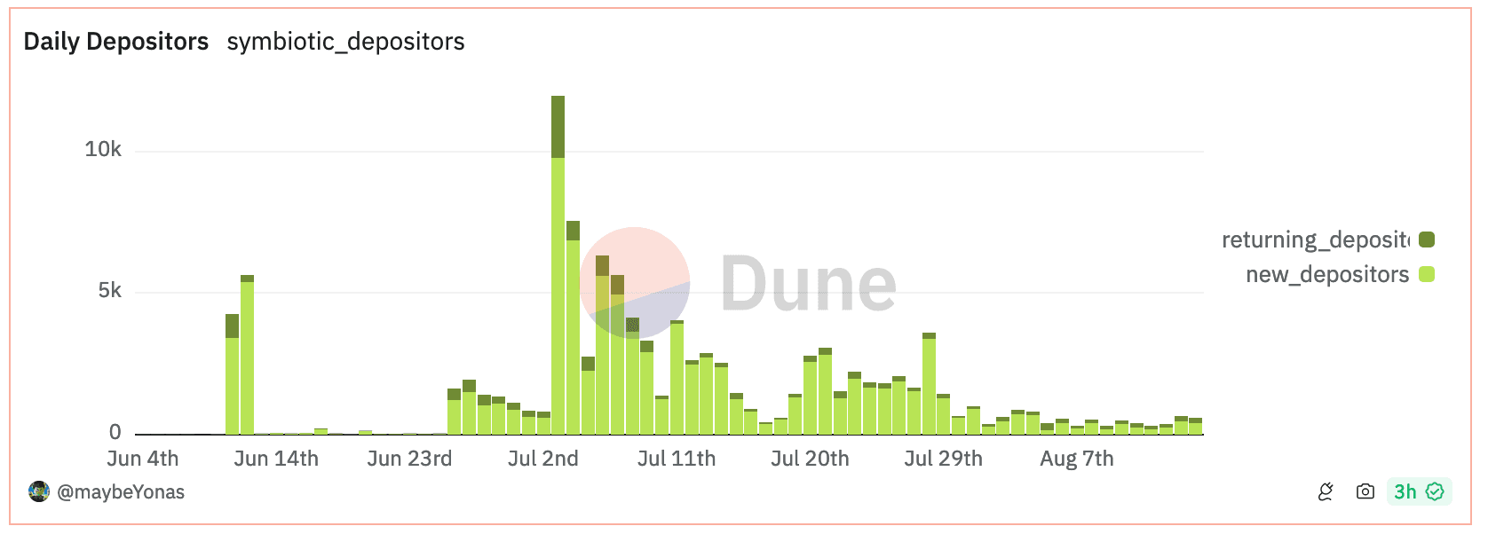Since June 26th, there has been a noticeable increase in the number of new depositors. A portion of these addresses have made subsequent deposits, although the daily count of these repeat deposits remains relatively low in comparison to the influx of newcomers.