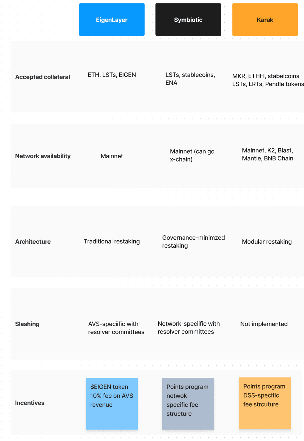 In slashing terms, Symbiotic and EigenLayer use preconfigured AVS/network-specific slashing terms with instances potentially contested by committees or resolvers. Karak has not yet implemented slashing, though this is being worked on. Documentation indicates a similar resolver system.
