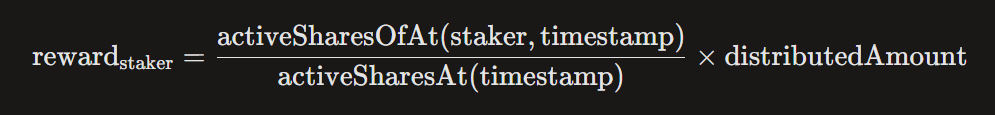 Staker rewards in Symbiotic vaults are crafted to remunerate participants who actively engage in staking their tokens. The rewards are allocated based on the proportion of active shares held by a staker at a specific timestamp in comparison to the aggregate total of active shares in the system.