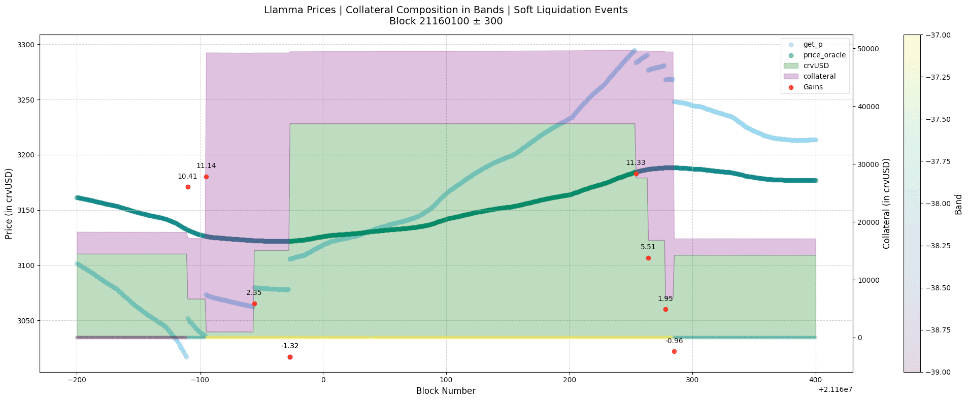 The red scatter in the above chart shows the swap events. The chart shows the oracle price (price_oracle) and the AMM price (get_p). It also shows the active band and the composition through time.
