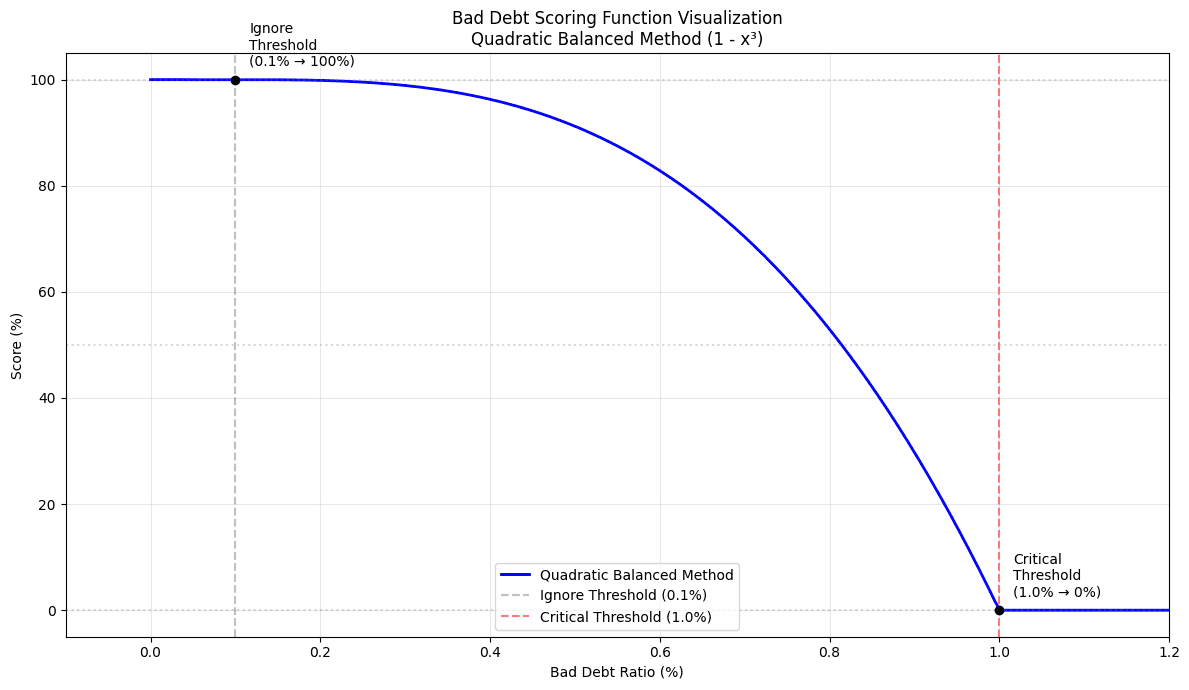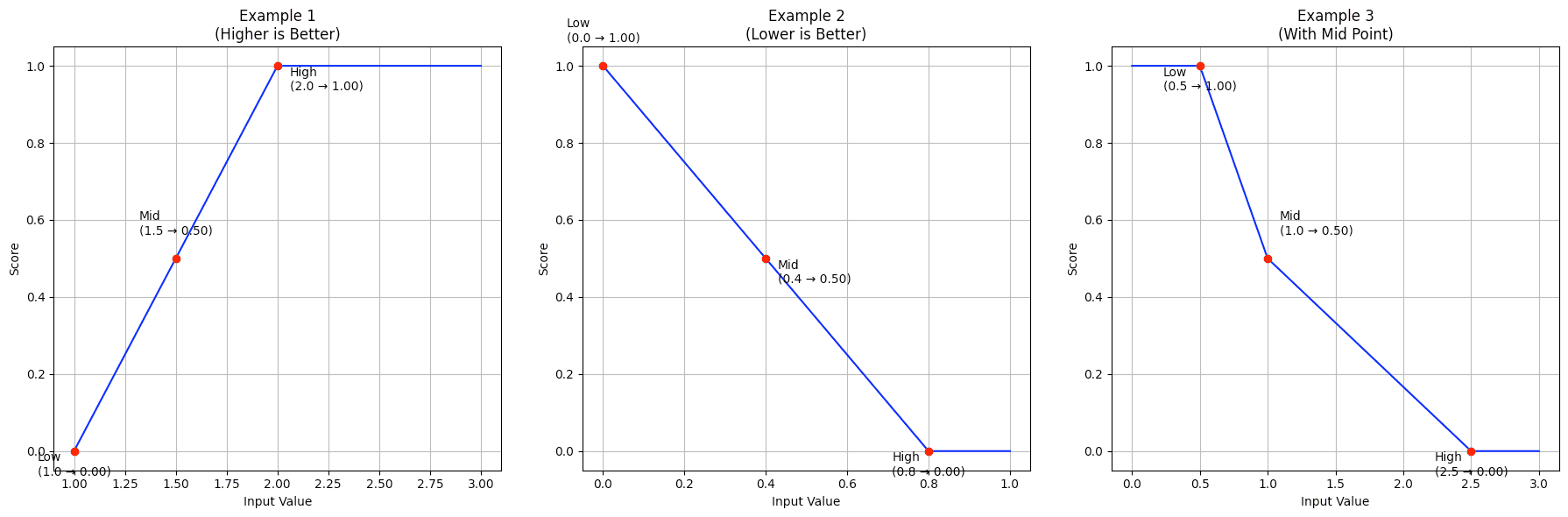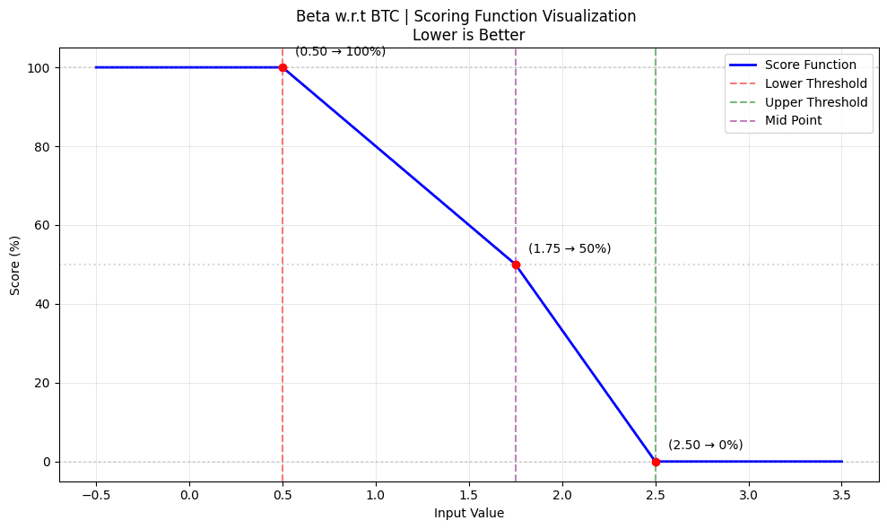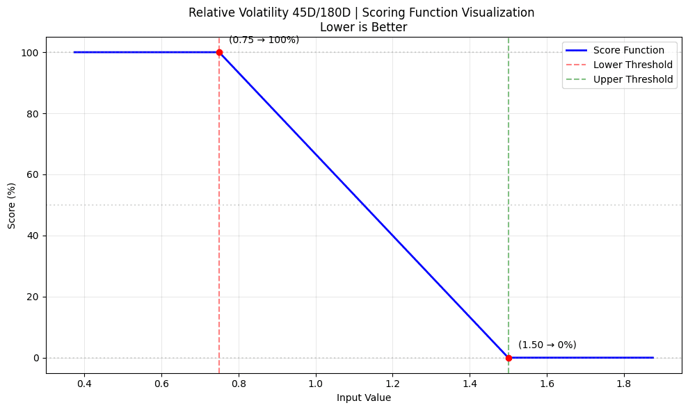 def spread_ratio_score(test_val, ref_val): ratio = test_val / ref_val if ratio <= 1: # Tighter spread than reference (good) return 50 + (50 * (1 - ratio)) # Score: 50-100 else: # Wider spread than reference (bad) return max(0, 50 * (25 - ratio) / 24) # Score: 0-50 -