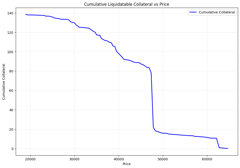 Using Curve's WBTC borrower distribution, we can model the cumulative liquidatable collateral. The chart below shows the liquidatable collateral vs price.