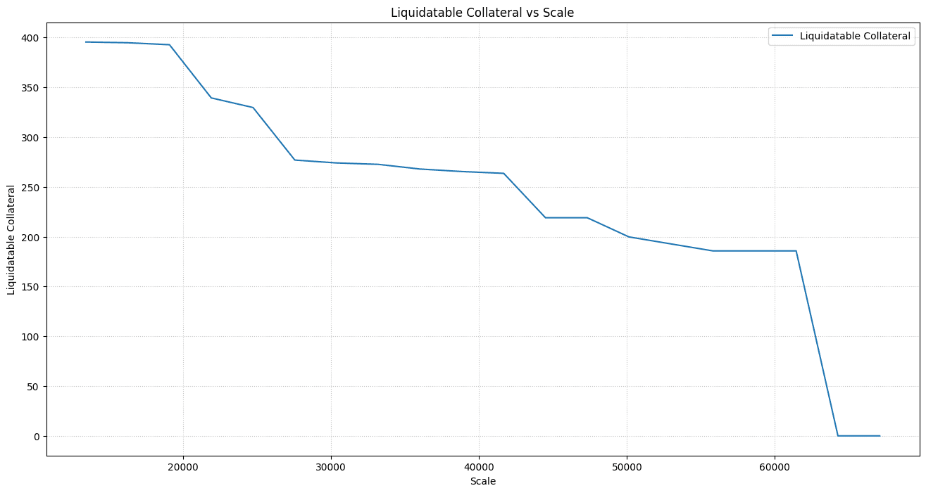 Profits will stay high so long as the price impact is minimal. With the scale value, where profits are maximized, we can be confident in saying that liquidators will profitably liquidate the relevant positions and thus ensure the market remains free from accruing bad debt. This remains true for a hypothetical price shock when the liquidatable collateral is as high as the scaled liquidatable collateral, allowing us to determine if the protocol is overexposed to a given asset or can safely increase its exposure.