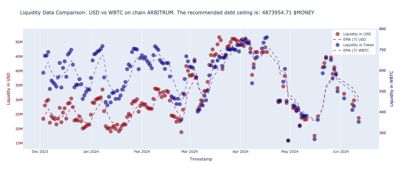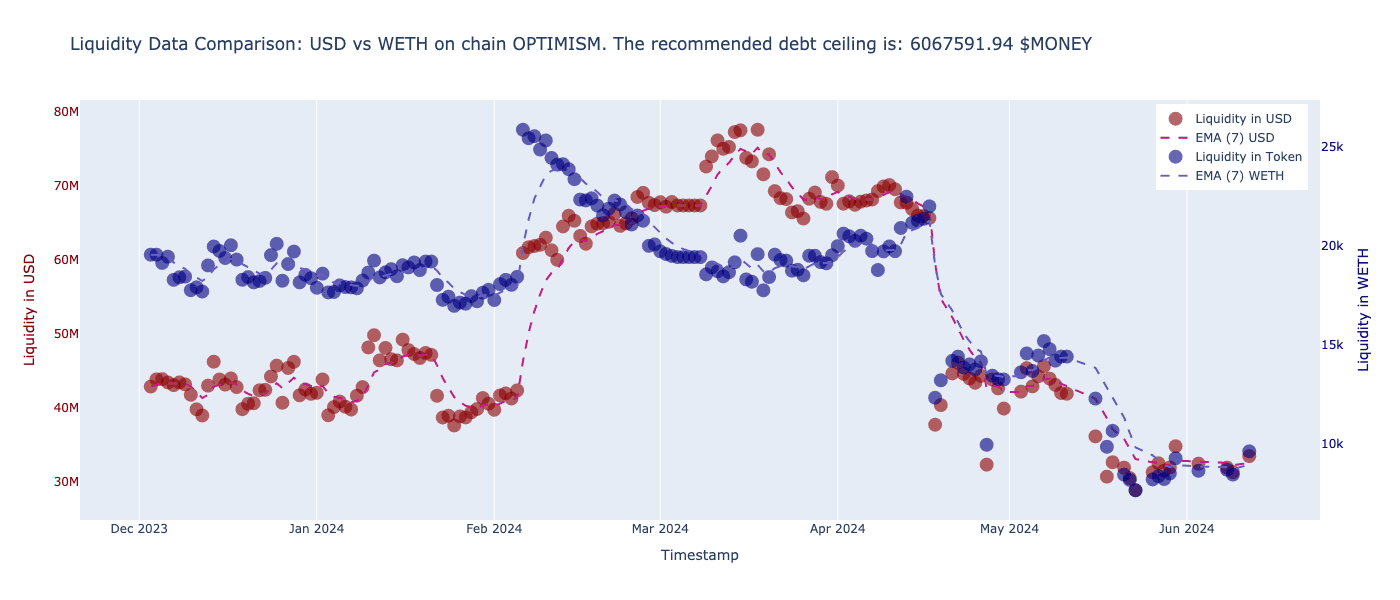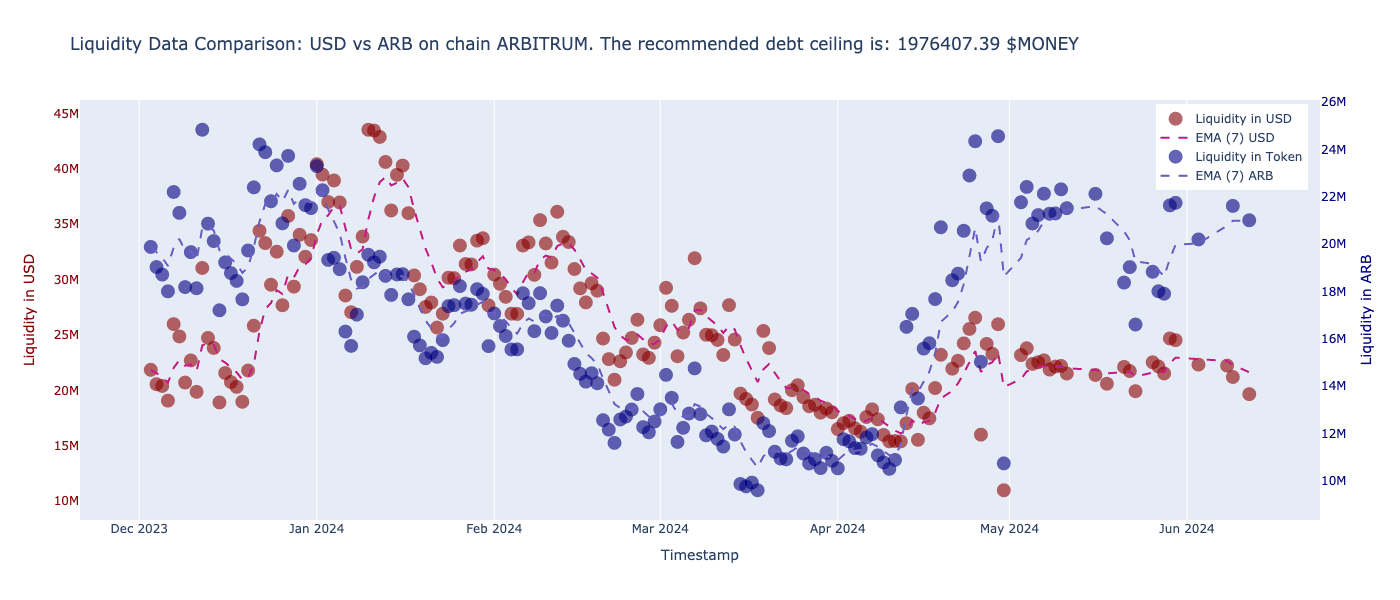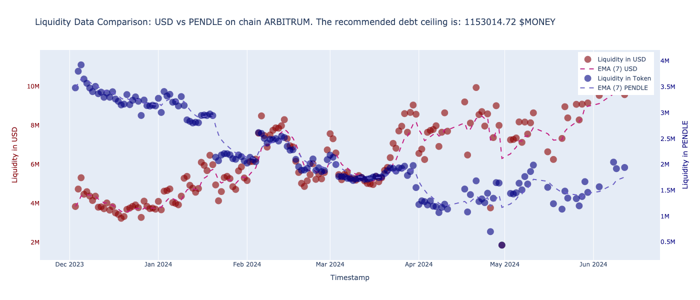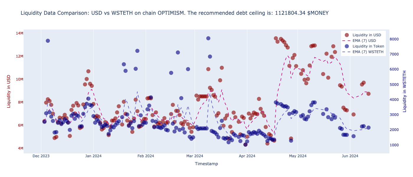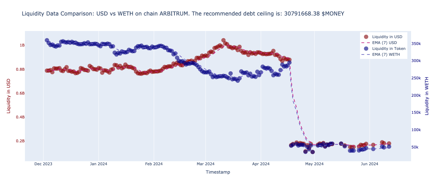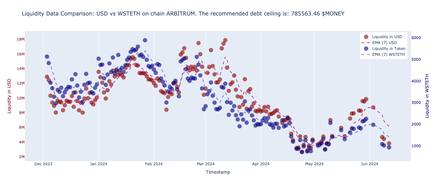 To define the debt ceiling for $MONEY markets, we leveraged the Dexguru API that aggregates liquidity across multiple pools. In cases where aggregated data was unavailable, we identified the most liquid pool. We collected 6 months of liquidity data for each asset, plotted it, and applied a 7-day Exponential Moving Average (EMA) to smooth short-term fluctuations and highlight trends. We identified the lowest liquidity point over the period and calculated 20% of the nominal token amount to determine the debt ceiling to ensure sufficient liquidity to facilitate orderly liquidations and arbitrage.