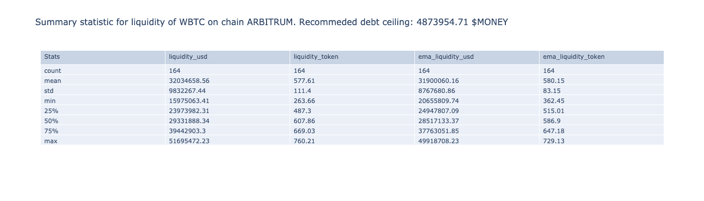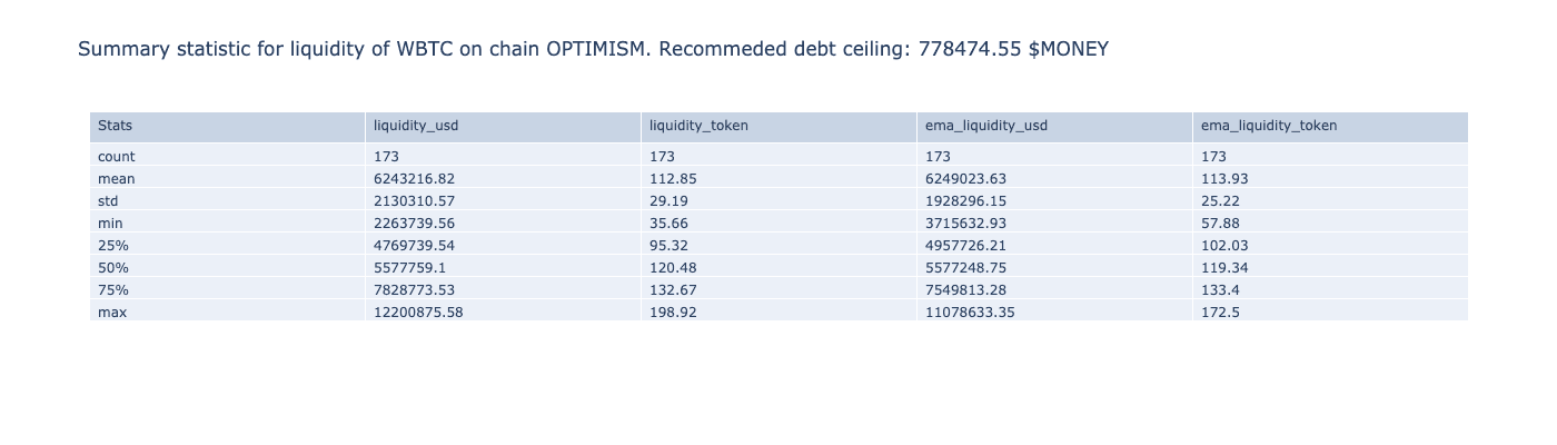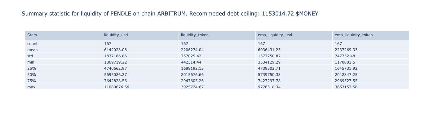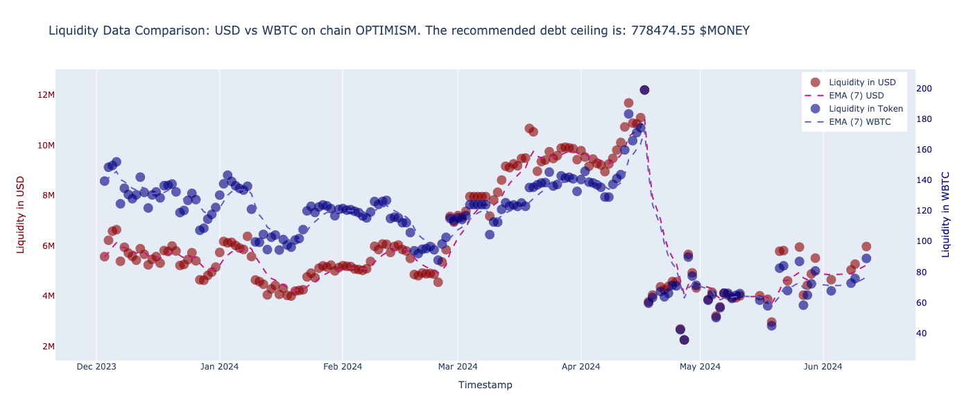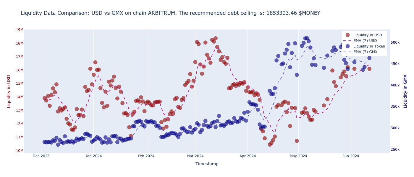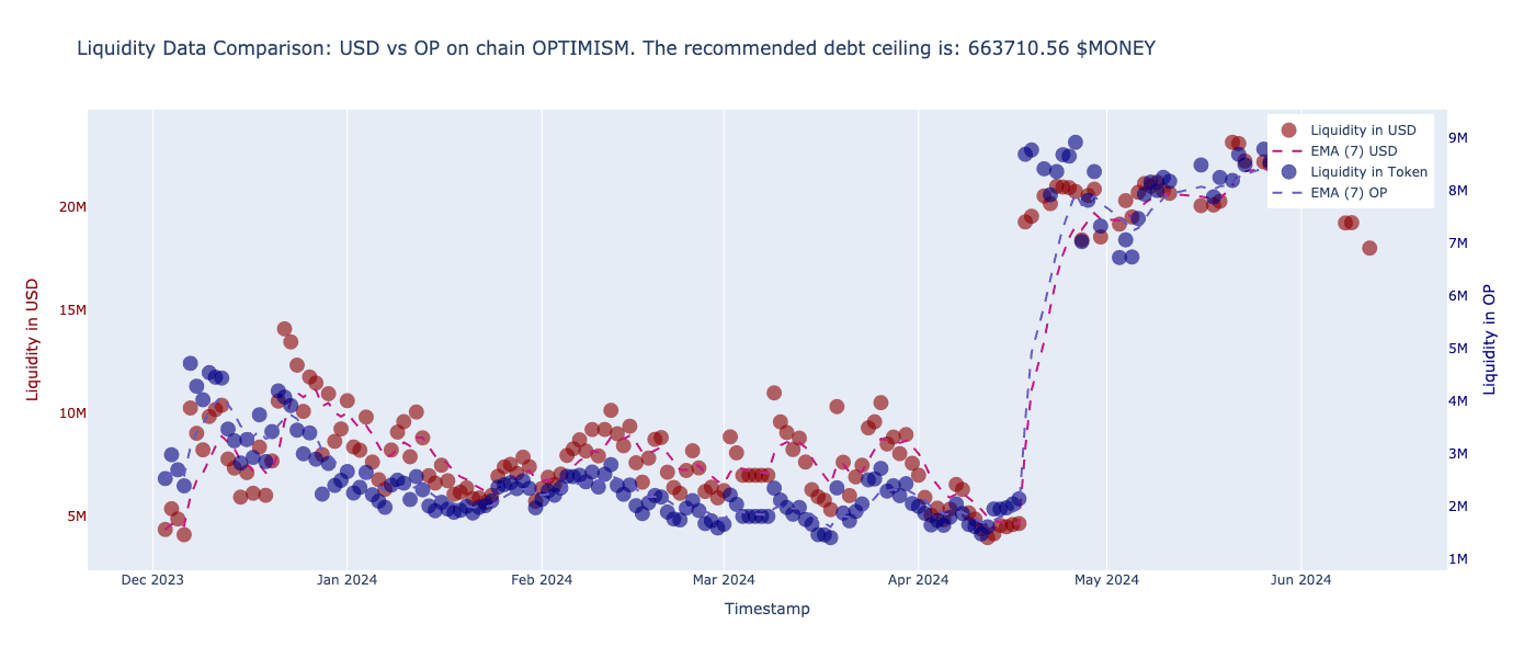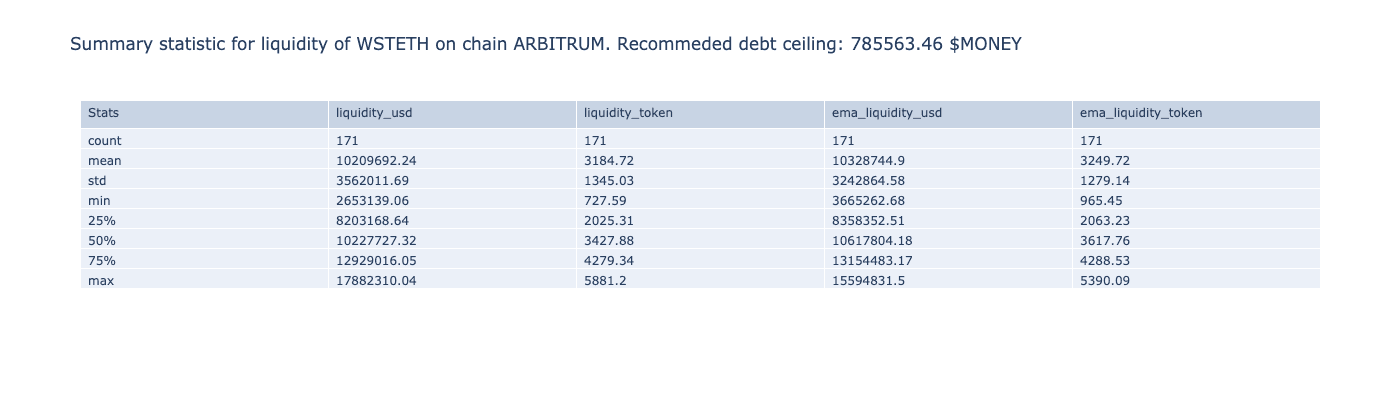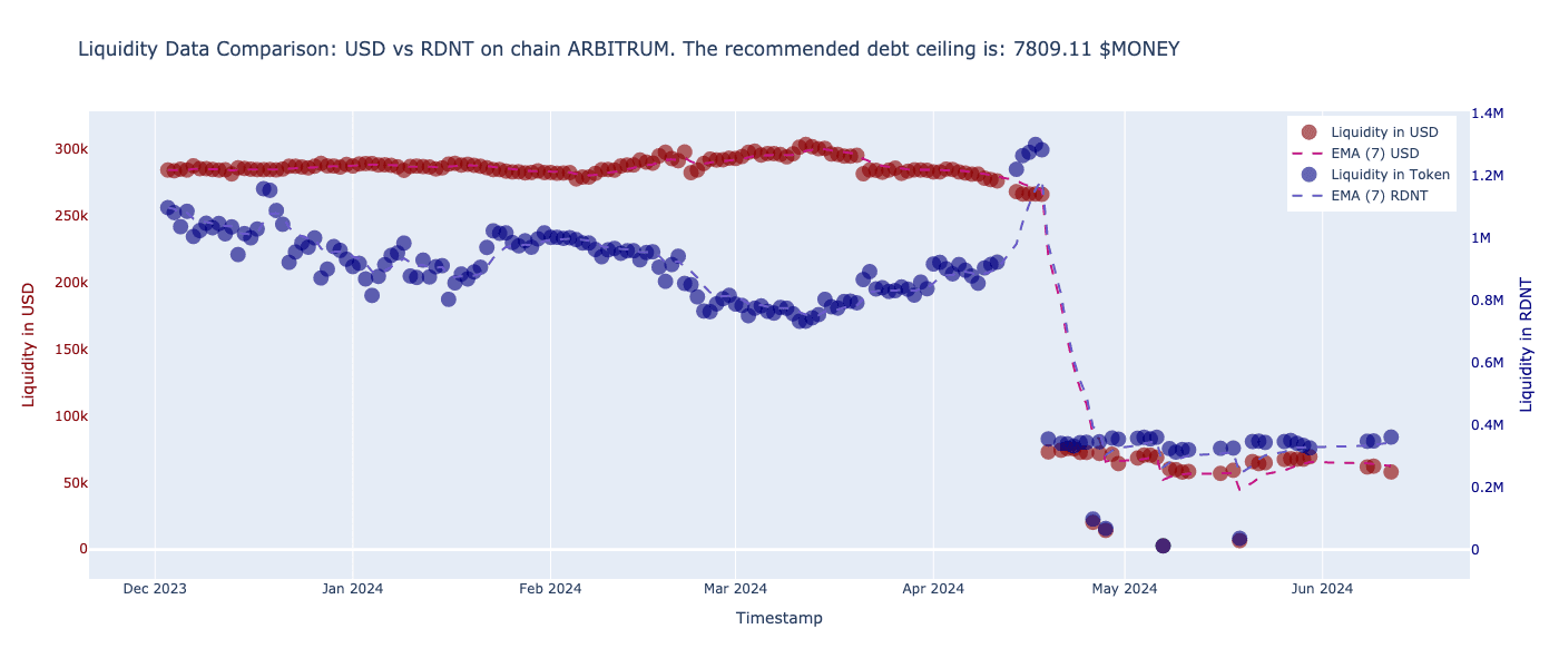 To define the debt ceiling for $MONEY markets, we leveraged the Dexguru API that aggregates liquidity across multiple pools. In cases where aggregated data was unavailable, we identified the most liquid pool. We collected 6 months of liquidity data for each asset, plotted it, and applied a 7-day Exponential Moving Average (EMA) to smooth short-term fluctuations and highlight trends. We identified the lowest liquidity point over the period and calculated 20% of the nominal token amount to determine the debt ceiling to ensure sufficient liquidity to facilitate orderly liquidations and arbitrage.