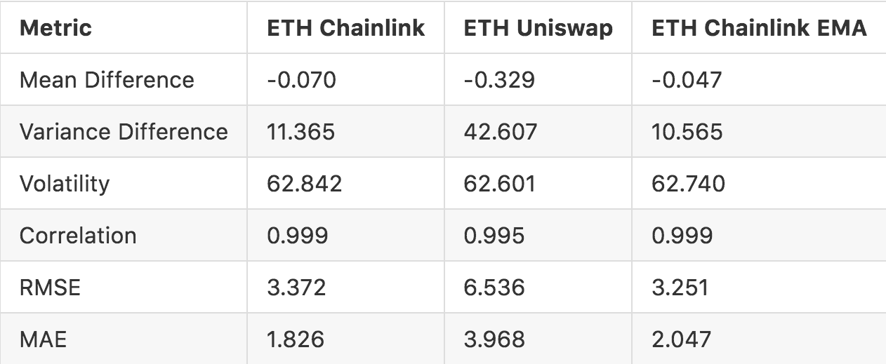 The EMA showed lower mean and variance differences compared to the raw Chainlink and Uniswap feeds, indicating better alignment with the baseline prices.