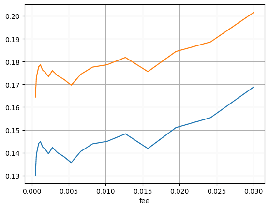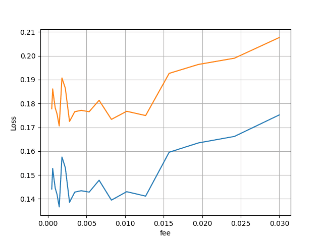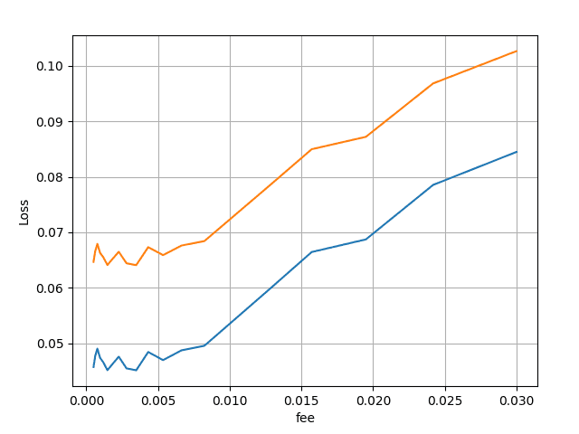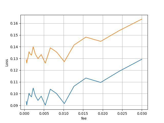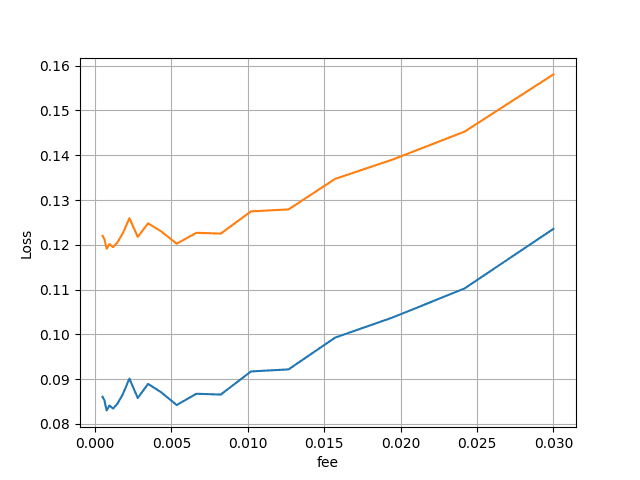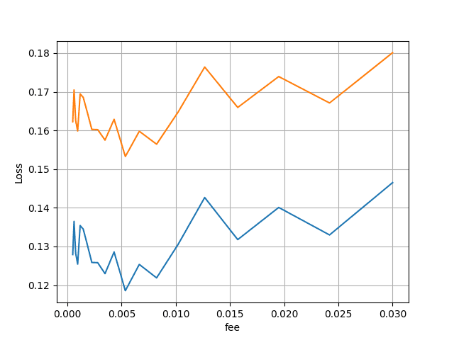 The graph indicates that the optimal fee is approximately where the loss is minimized. A minor trade-off could involve using higher fees, equal to 0.00146860 and 0.00347738, hence we select 0.2%.