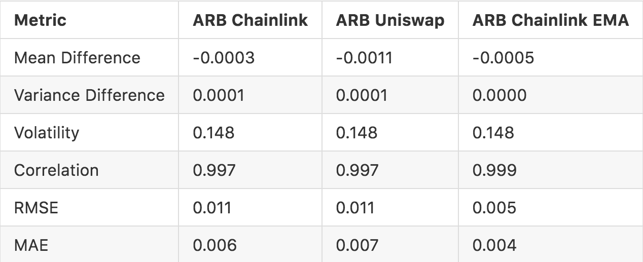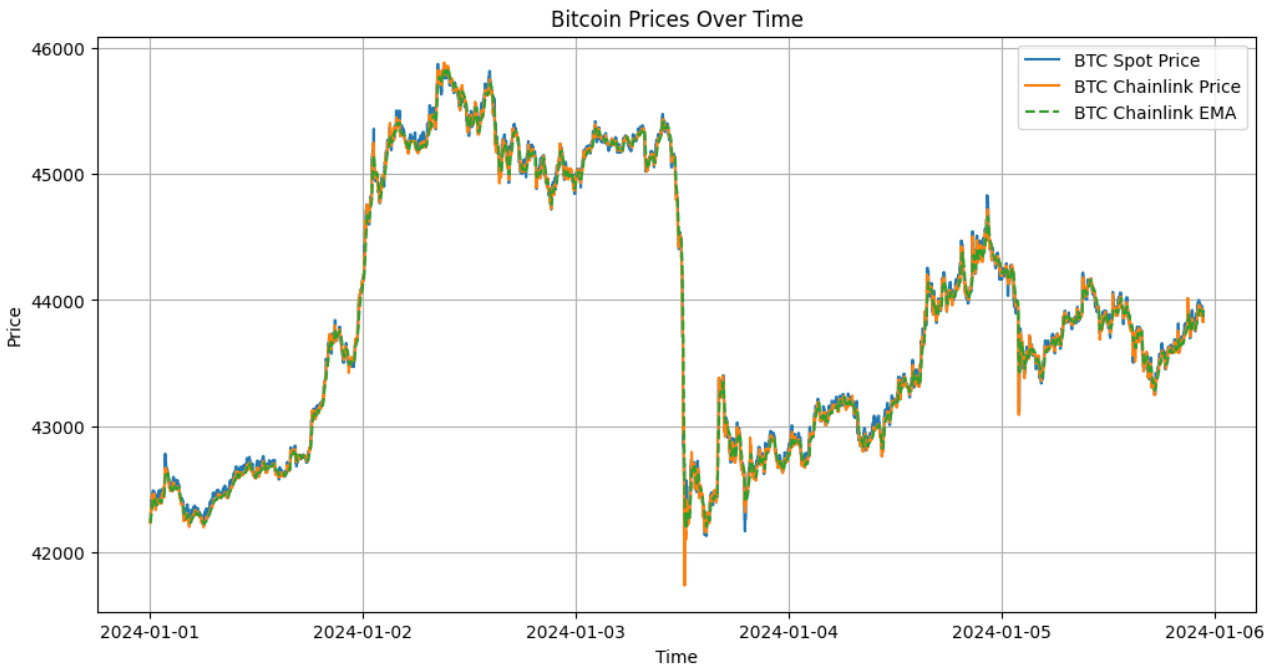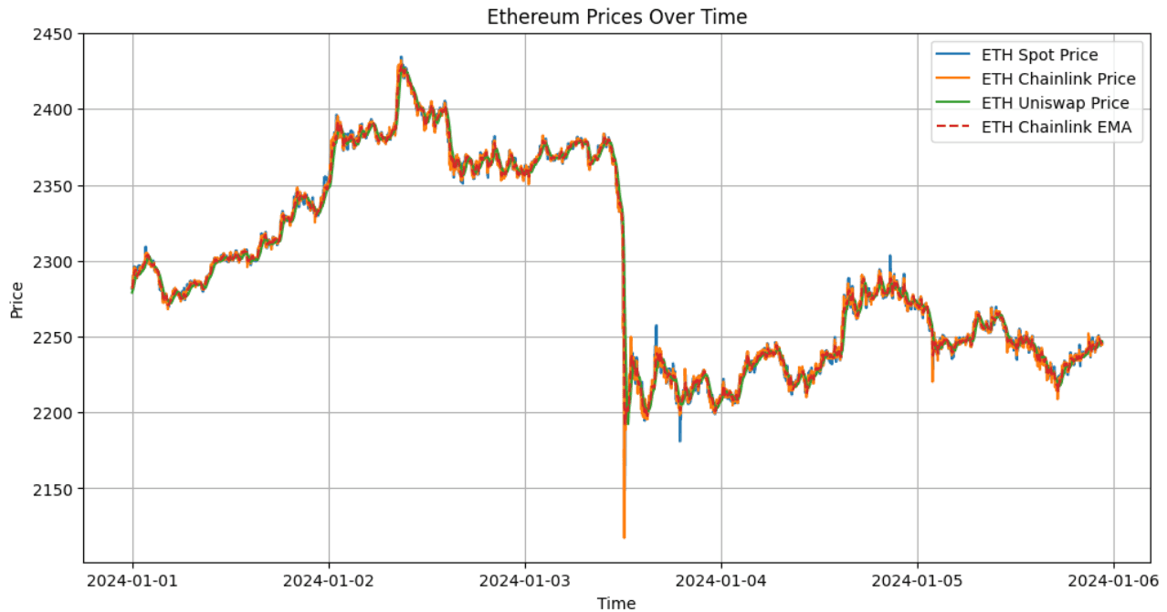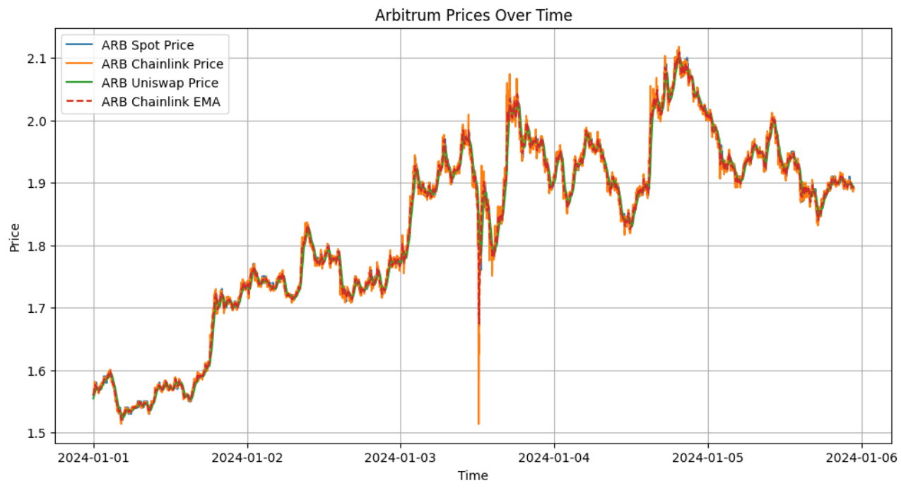 The analysis focused on comparing different price feeds to assess their reliability, volatility, and overall performance. The primary price feeds examined were Chainlink, Uniswap TWAP, and the Exponential Moving Average (EMA) derived from the Chainlink feed. The baseline prices were taken from spot prices for ETH, BTC, and ARB.