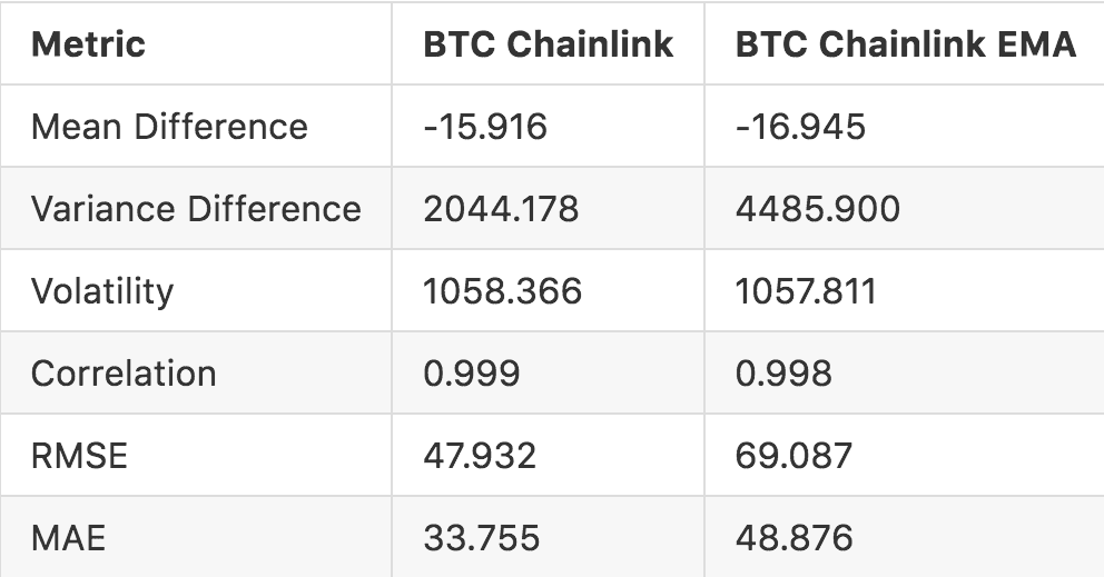 The EMA was evaluated as a smoothing technique for the Chainlink price feed.