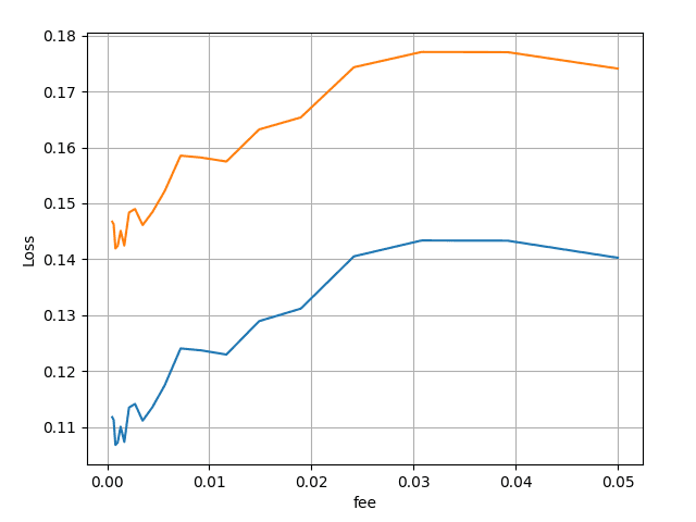 The graph suggests that the optimal fee is where the loss is at the minimum and is equal to approx. 0.15% (0.001318).