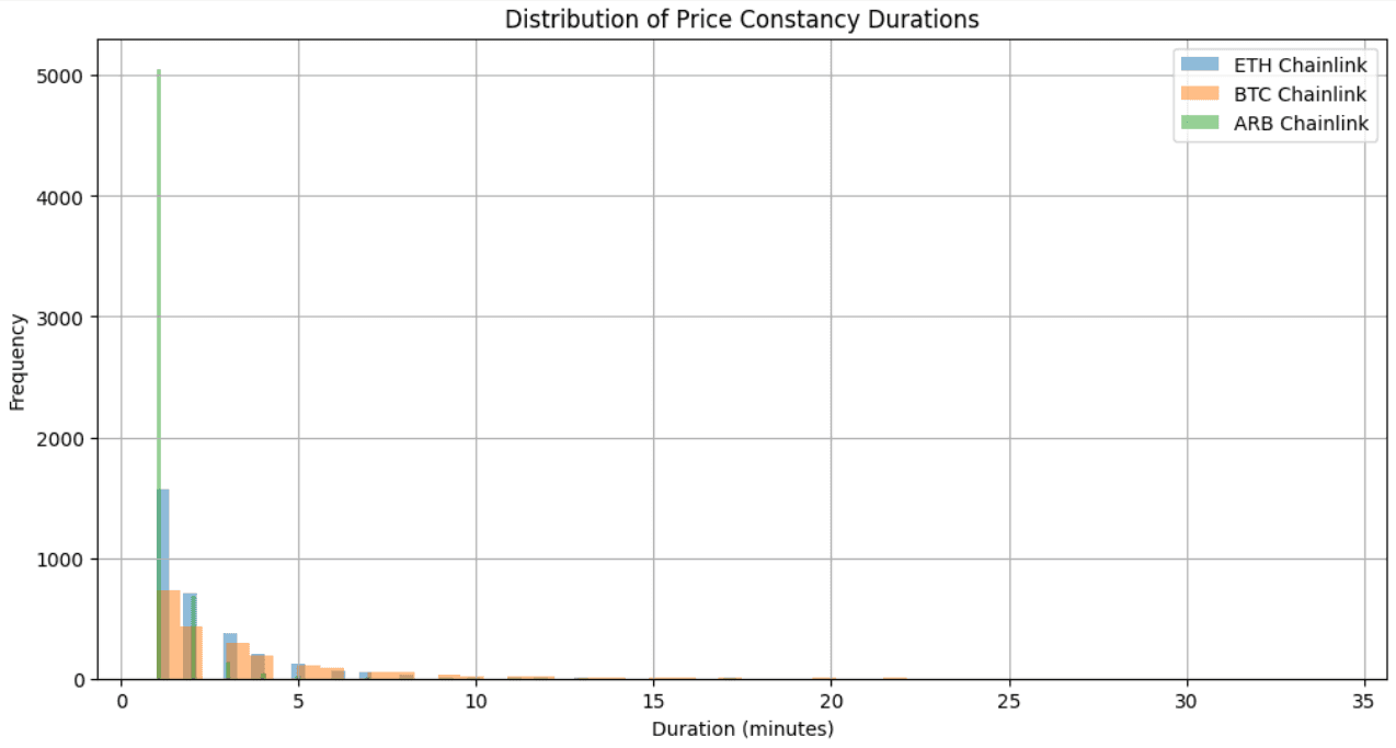The duration for which Chainlink prices remained constant was calculated to understand the frequency of updates. The analysis provided insights into the regularity and reliability of the Chainlink price feeds for ETH, BTC, and ARB.