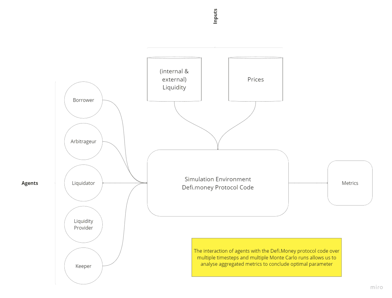 Simulation: The system's state transitions are driven by the agents' interactions with market prices and liquidity, which are provided externally. The simulation captures how these interactions impact the protocol's performance.