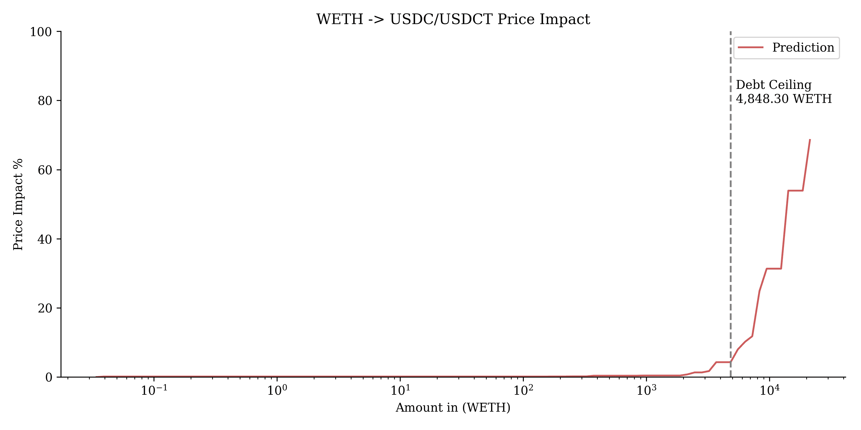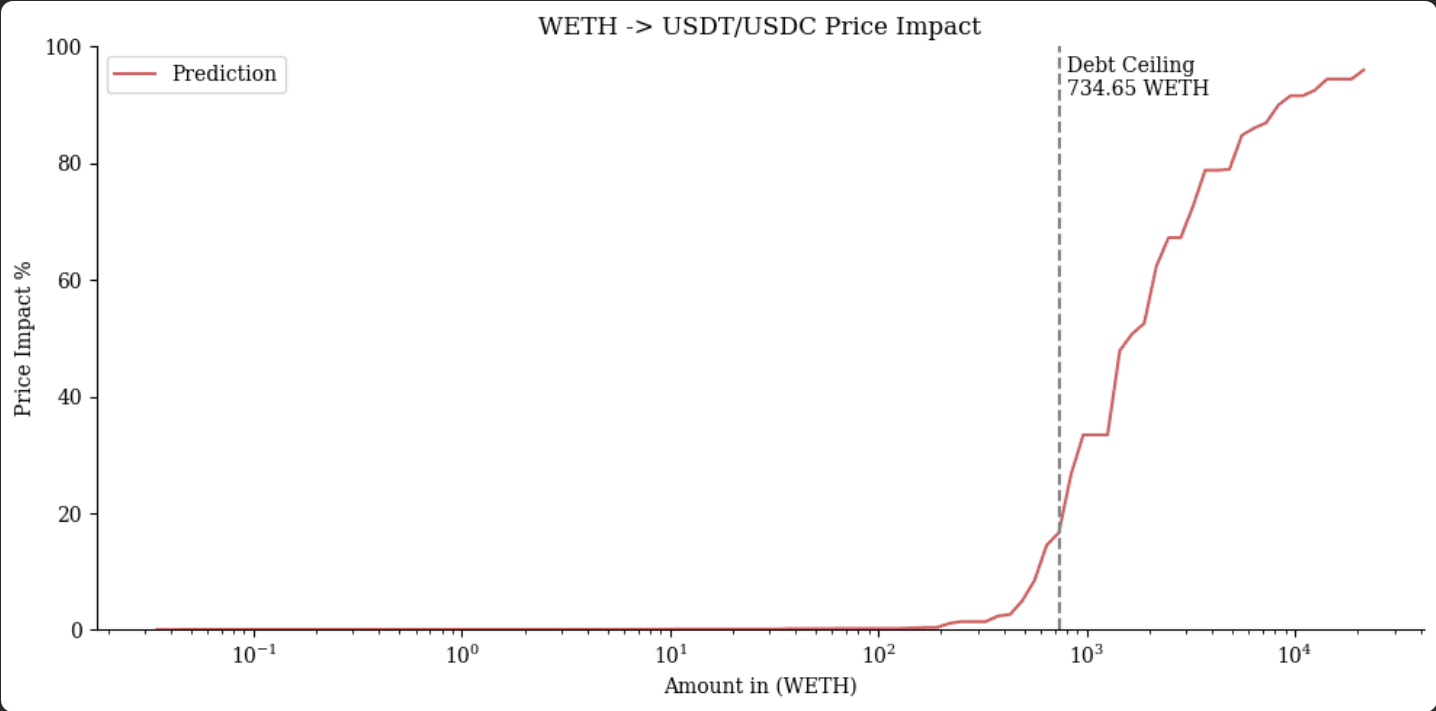 This chart shows the price impact of swapping $WETH into USDC/USDT. The debt ceiling is set at 734.65 WETH, beyond which the price impact increases sharply, indicating larger slippage for swaps exceeding this threshold.