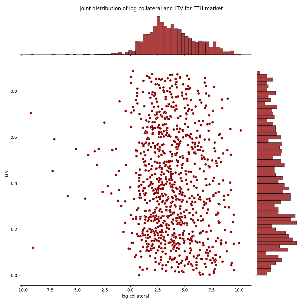 Below we show the joint distribution of the log-collateral of sampled borrower positions and their associated LTV for the WETH market.
