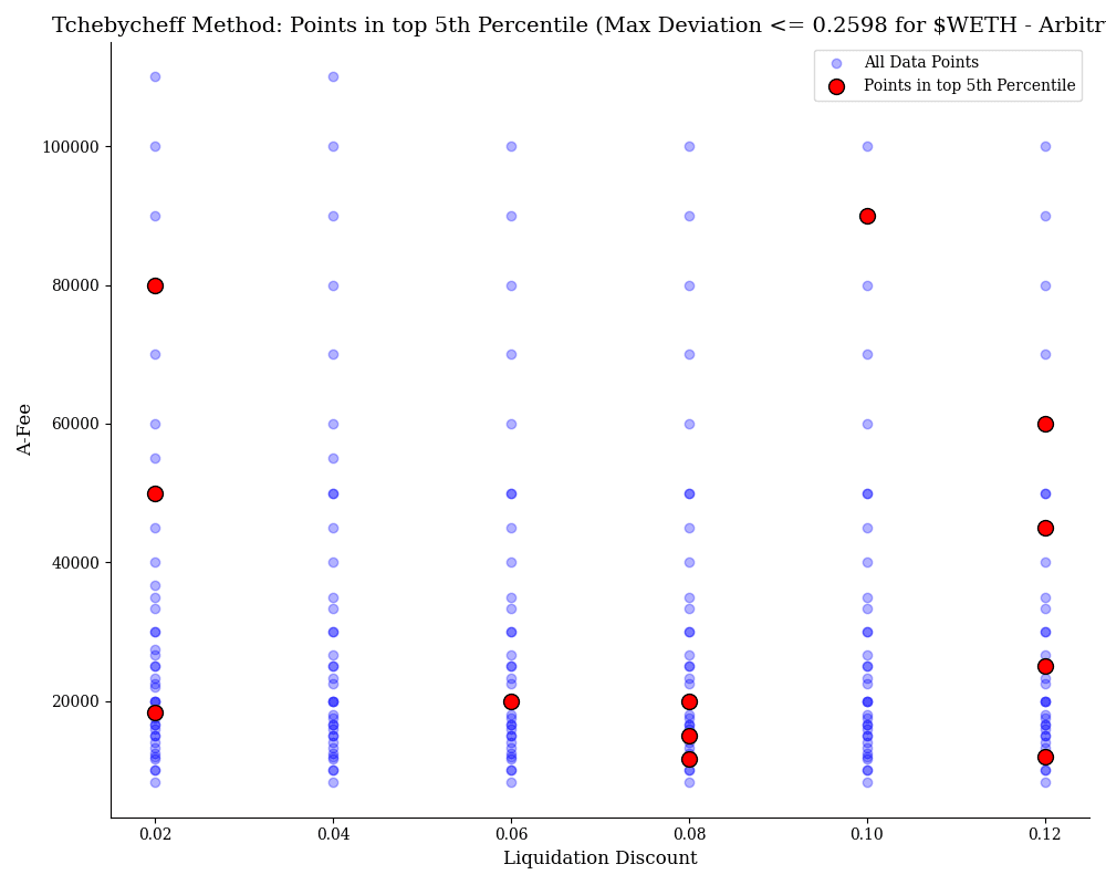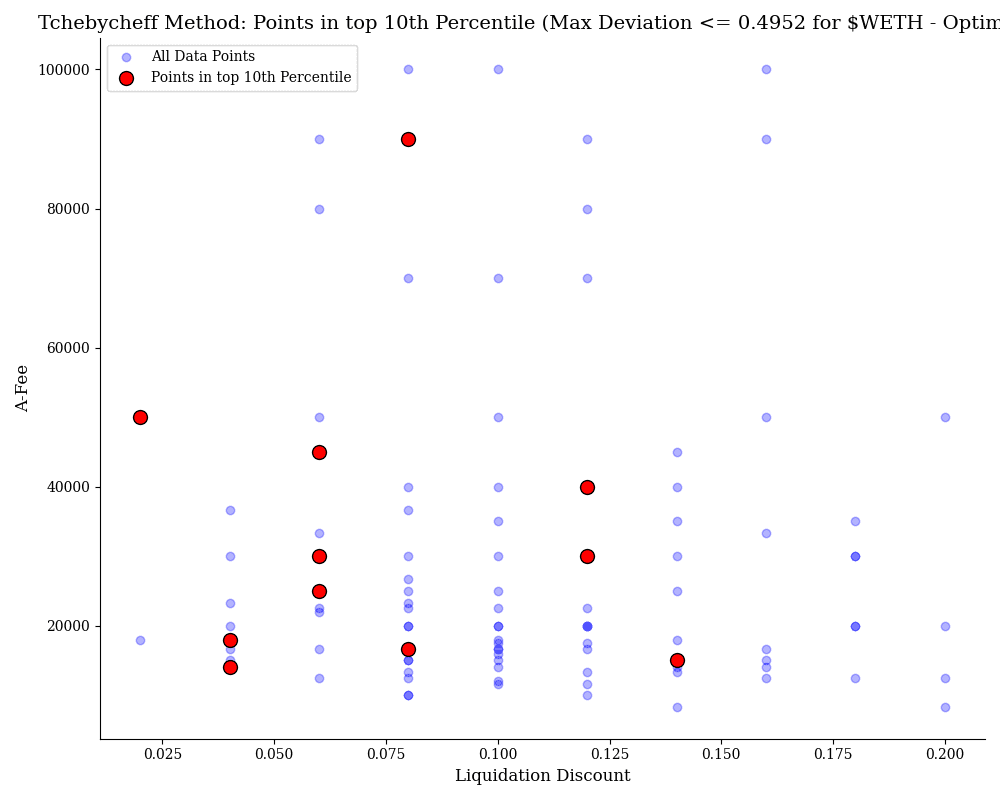 Based on our simulations, $WETH performed consistently well with a balanced trade-off between liquidation discount and A-Fee. The results show minimal bad debt scenarios and the Tchebycheff method yielded stable optimal configurations. The liquidity curve further suggests that $WETH can handle larger swaps without significant slippage. The debt ceiling of 4,848.30 WETH (13M MONEY) is recommended to avoid price impact spikes.