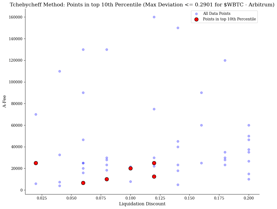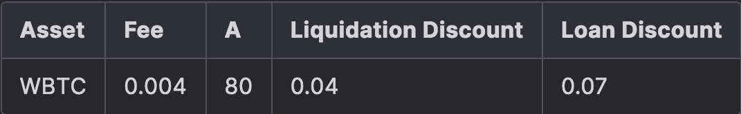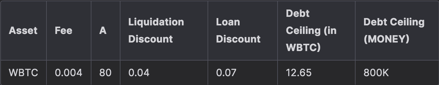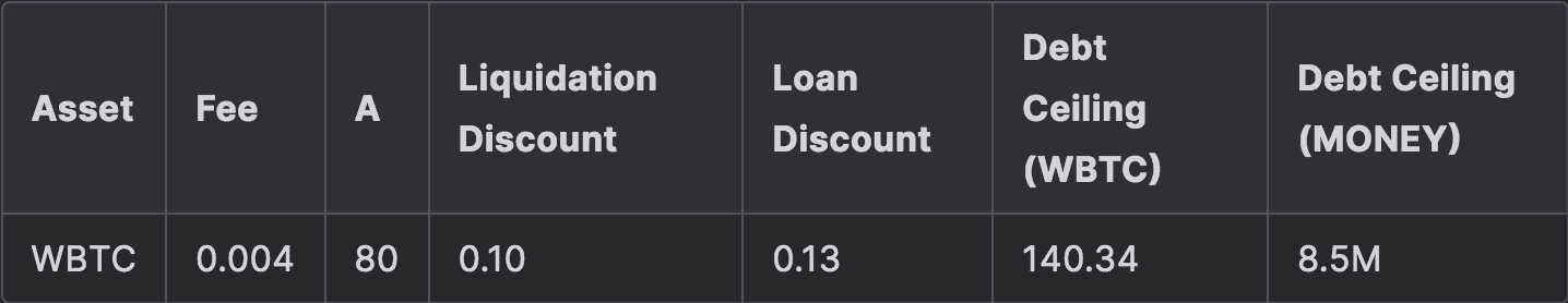 Recommendation: We recommend maintaining the current settings for the existing $WBTC-Arbitrum market, noting that it has been instantiated with our initial recommended values of fee: 0.2%, A: 89, liquidation_discount: 4%, loan_discount: 7%. The current debt ceiling of the $WBTC-Arbitrum market is 800K MONEY. From a market risk perspective, it can be safely raised to 8.5M max debt.