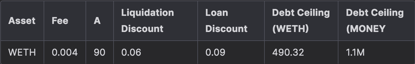 Recommendation: We recommend continuing with the current parameter configuration for the $WETH market, noting that it has been instantiated with our initial recommendations of fee: 0.2%, A: 72, liquidation_discount: 4%, loan_discount: 7%. The current debt ceiling of the $WETH market is 1.75M MONEY. As current debt is only ~162K MONEY, we recommend reducing the debt ceiling to 1.1M until further review.