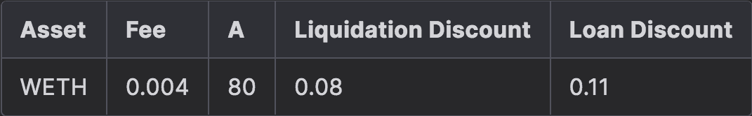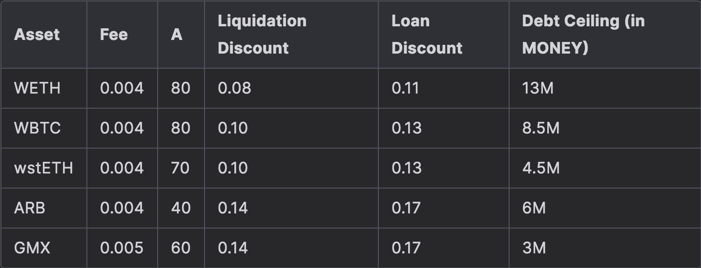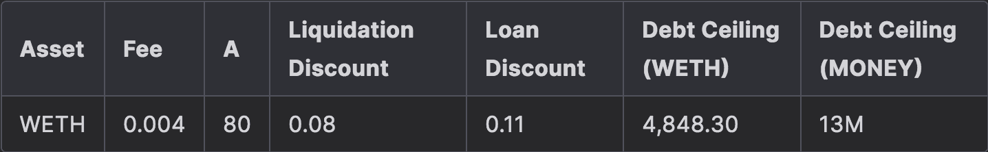 Recommendation: We recommend maintaining the current parameters for the existing $WETH market on Arbitrum, noting that the market has been instantiated with our initially recommended values of fee: 0.2%, A: 72, liquidation_discount: 4%, loan_discount: 7%. The current debt ceiling of the $WETH-Arbitrum market is 1.5M MONEY. From a market risk perspective, it can be safely raised to 13M max debt.