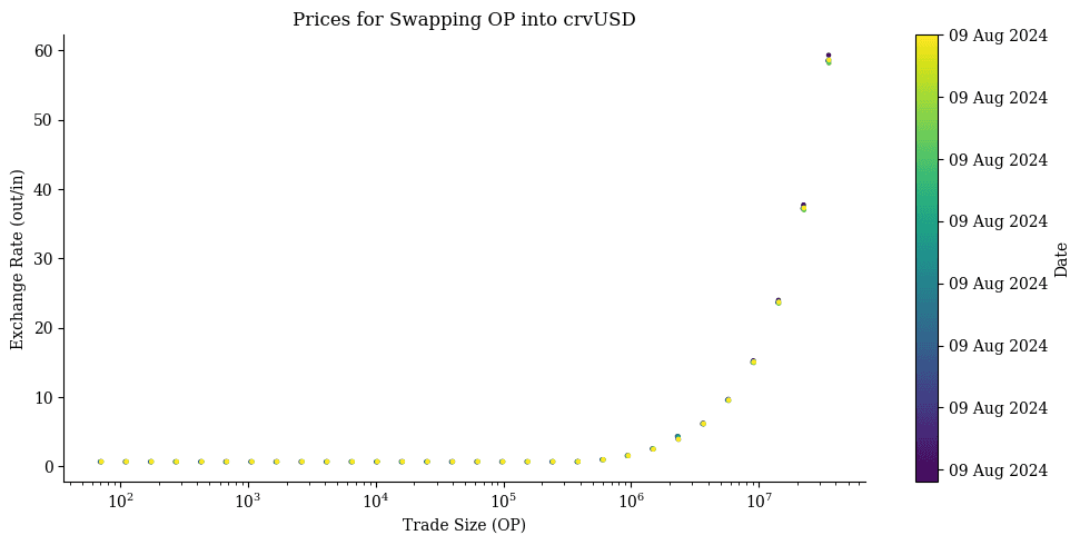 $OP on Optimism showed slightly more volatility with a higher maximum deviation, but several viable configurations were identified. The liquidity curve supports moderate swaps, though the slippage increases for larger transactions. A debt ceiling of 973,345.24 OP (1.5M MONEY) is recommended to balance liquidity and price impact.