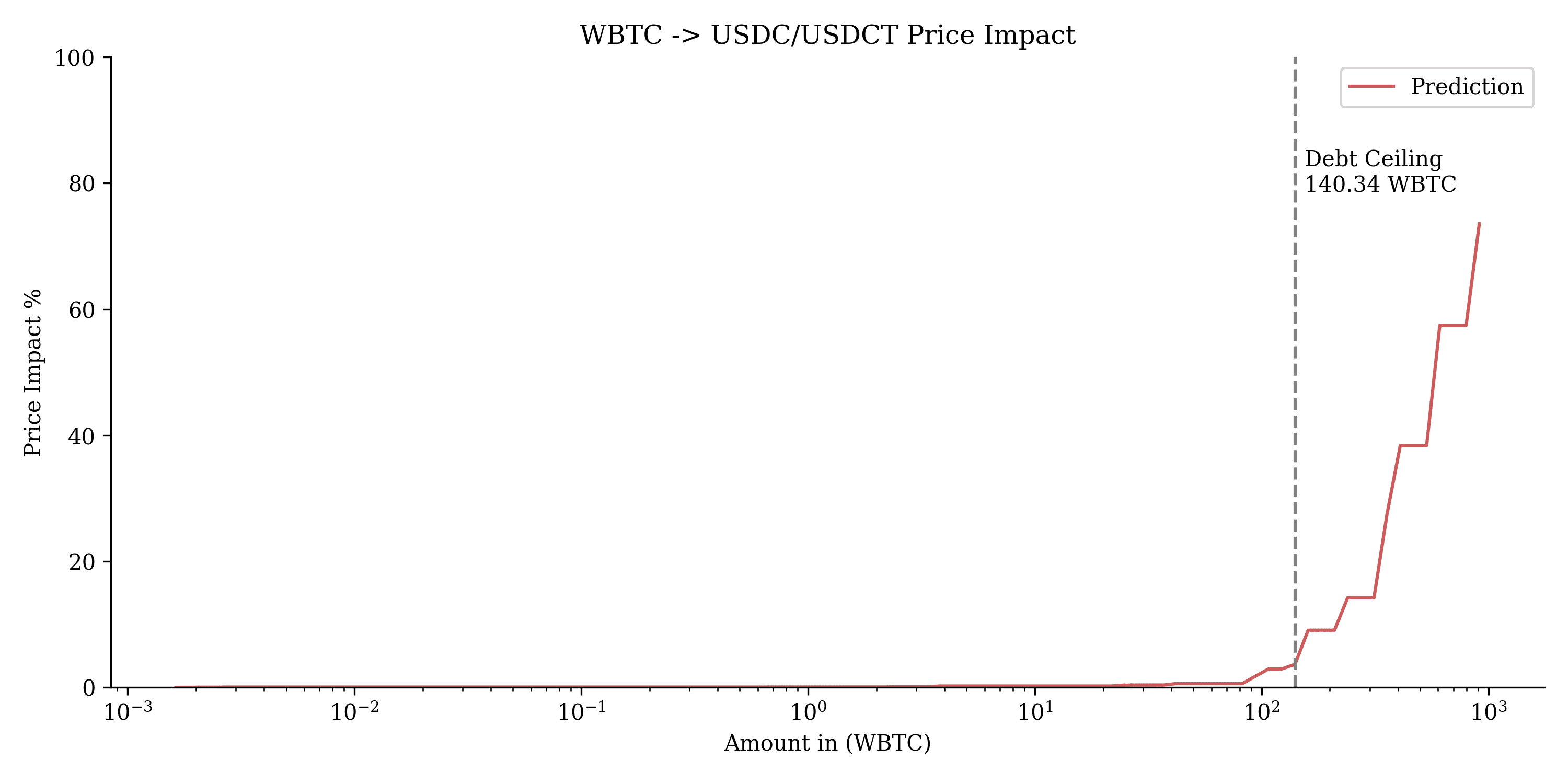 This chart shows the price impact of swapping $WBTC into USDC/USDT. The debt ceiling is set at 140.34 WBTC, beyond which price impact increases rapidly, indicating higher slippage for larger swaps above this threshold.