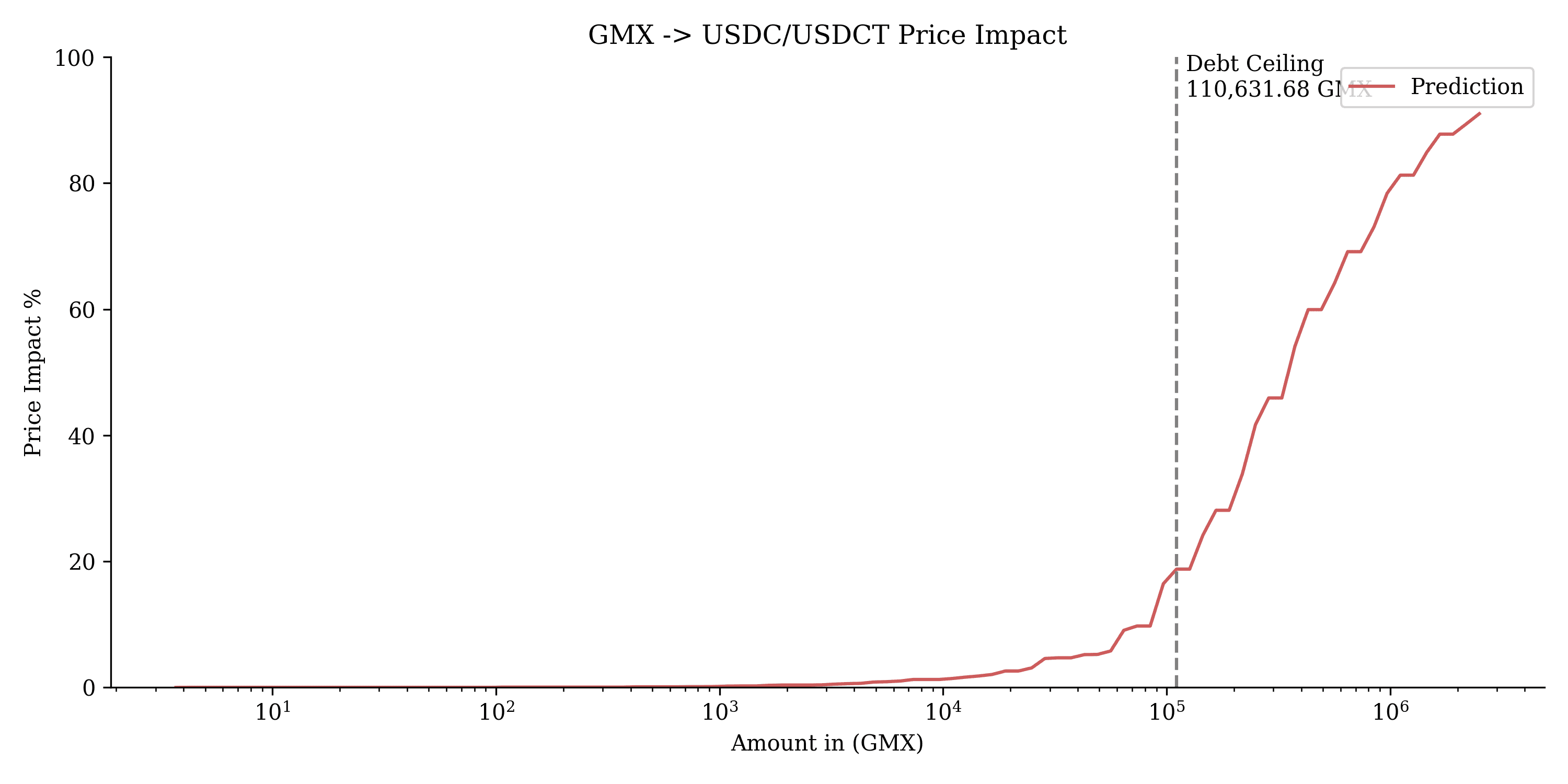 This chart shows the price impact of swapping $GMX into USDC/USDT. The x-axis represents the amount of $GMX swapped, while the y-axis shows the percentage of price impact. Beyond the debt ceiling of 110,631.68 GMX, marked by the vertical dashed line, price impact increases significantly, indicating a sharp rise in cost for larger swaps beyond this threshold.