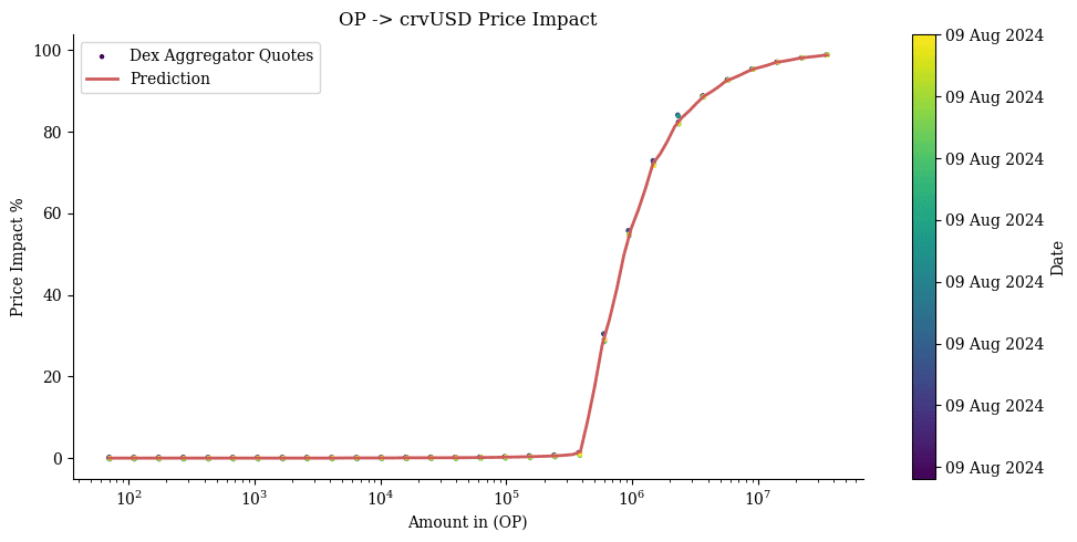 For the broader context of our simulations, the external liquidity for each collateral asset is modeled using a price impact curve. This curve begins at zero for infinitesimally small trades and asymptotically approaches a 100% impact as trade size increases.