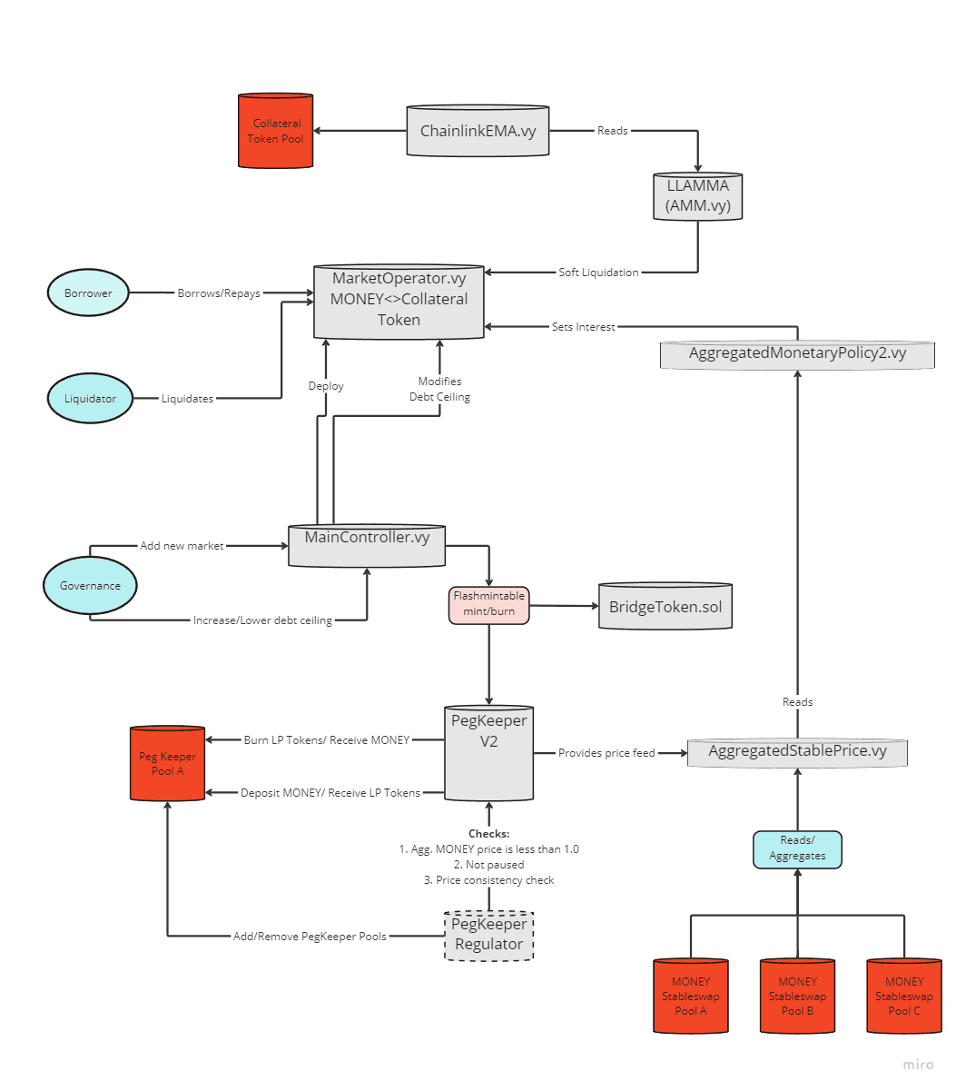 The underlying protocol, built on the Curve Finance crvUSD architecture, protects the borrower from collateral price volatility through a soft-liquidation process that automatically rebalances borrow positions between MONEY and collateral asset. It is based on the LLAMMA system, here renamed the "Automated Loan Protection" system.