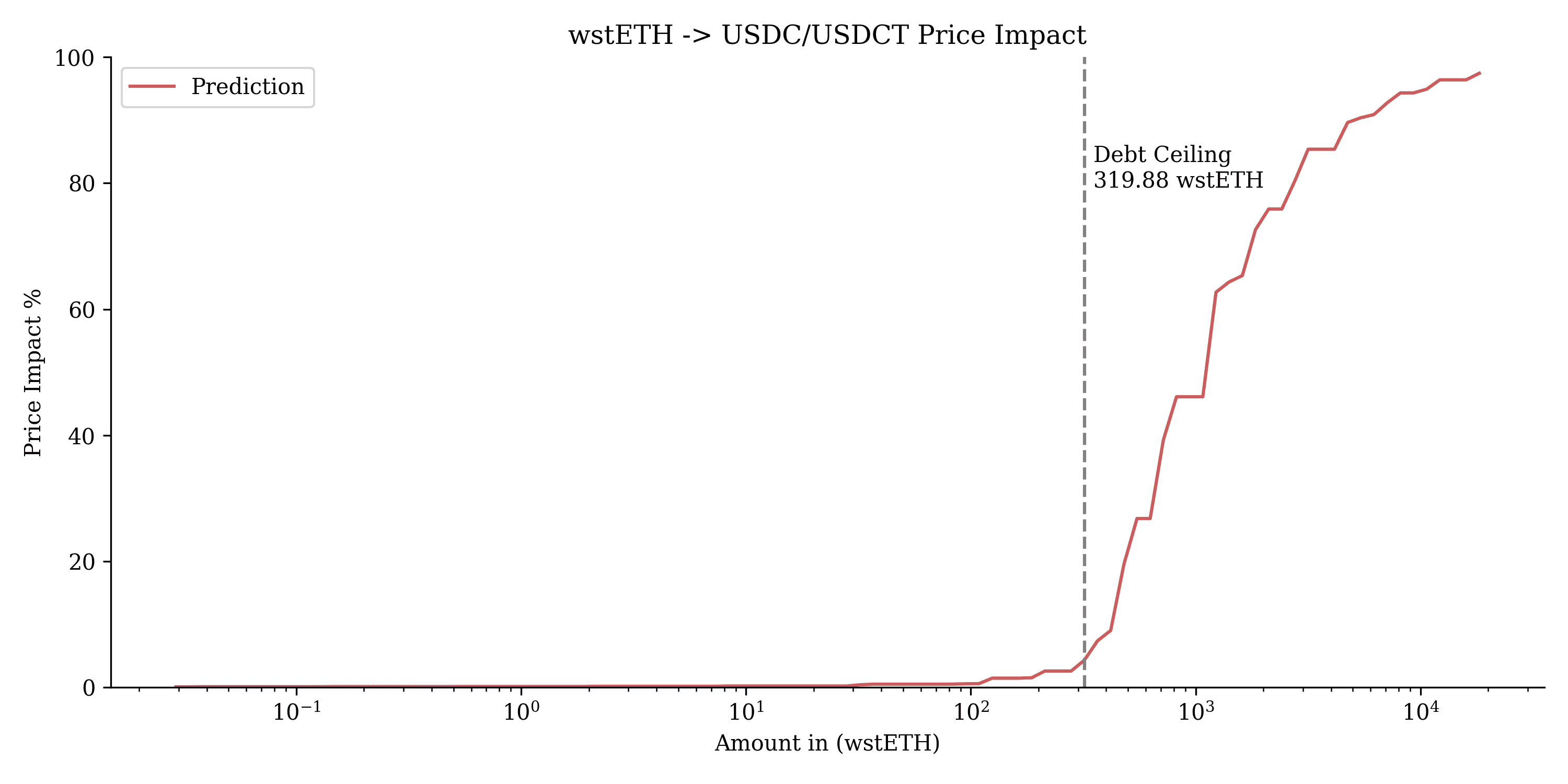 This chart shows the price impact of swapping $wstETH into USDC/USDT. The debt ceiling is set at 319.88 wstETH, beyond which the price impact increases significantly, indicating larger slippage for swaps exceeding this threshold.