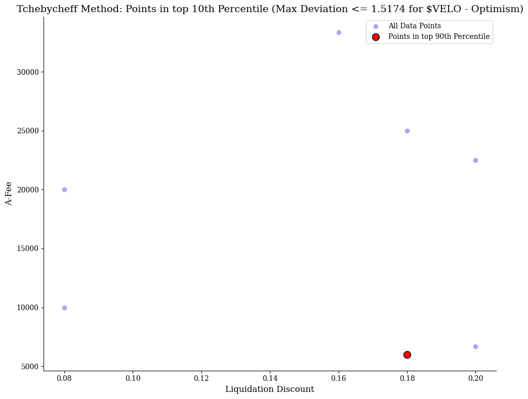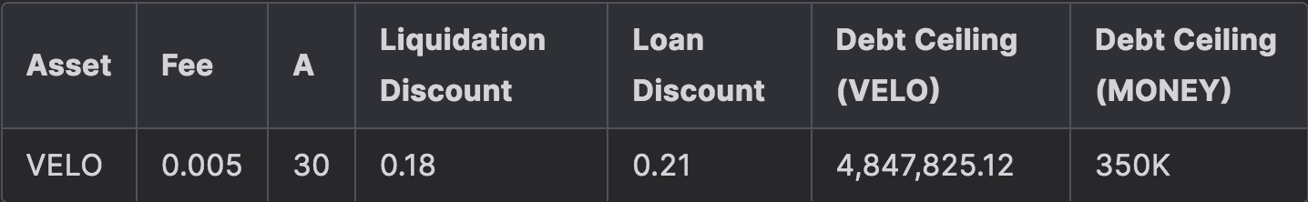 $VELO demonstrated less precise optimization results, with high deviation and fewer viable solutions. Liquidity is limited, making larger swaps difficult without significant slippage. A debt ceiling of 4,847,825.12 VELO (350K MONEY) is recommended to manage liquidity efficiently, though the results indicate caution.