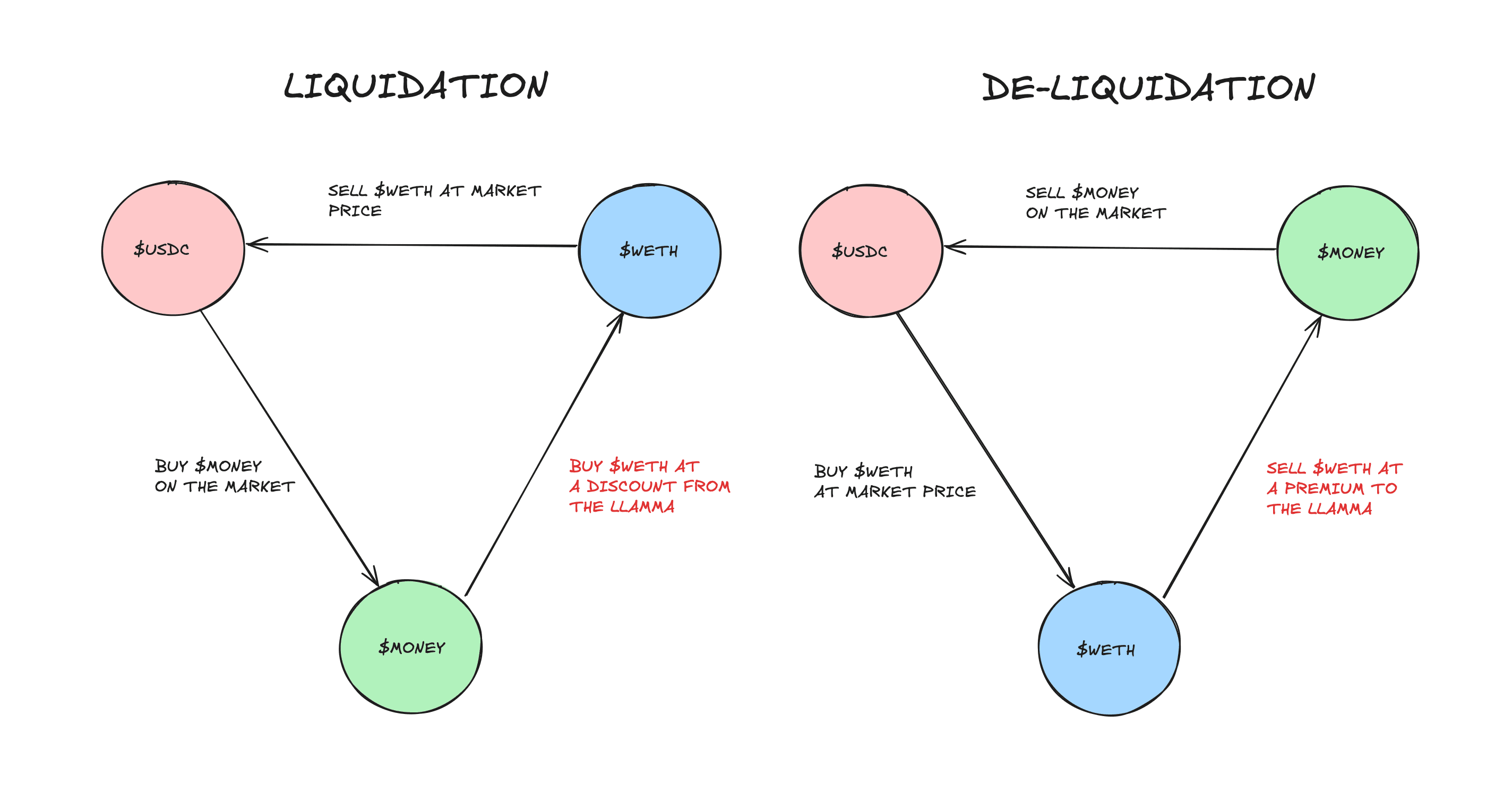 This phenomenon is modeled by using the price impact curves of each Pegkeeper pool. Hence, a large acquisition of MONEY will cause the collateral price to decrease, potentially triggering further liquidations in the system.