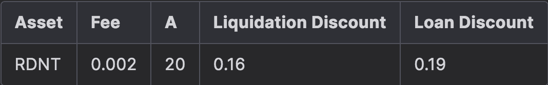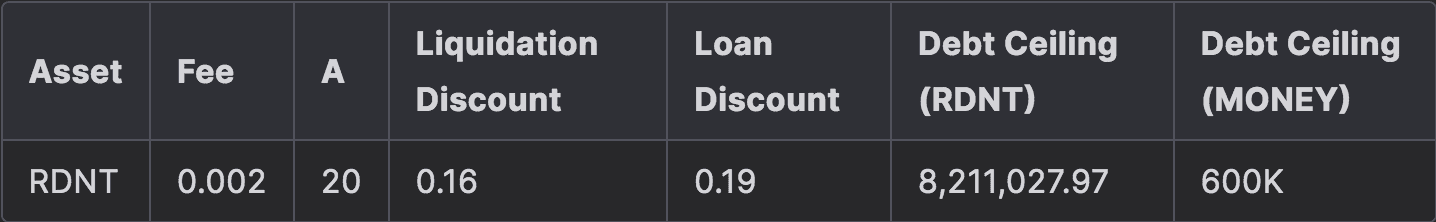 $RDNT presented similar issues to $PENDLE, with high deviation and limited optimal configurations. The liquidity profile is too thin, with a debt ceiling of 8,211,027.97 RDNT (600K MONEY) leading to significant slippage even with moderate swaps. This poses a risk of volatility.