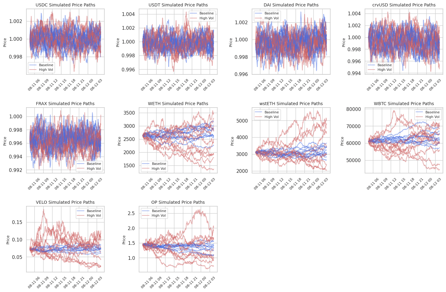 Below we show, as an illustrative example, generated price trajectories for some assets on Optimism. We present two scenarios: