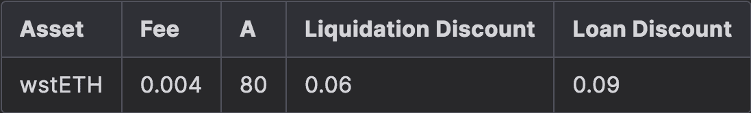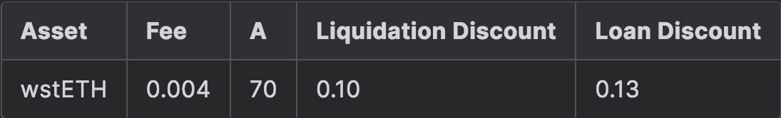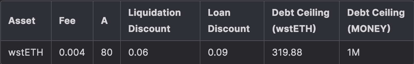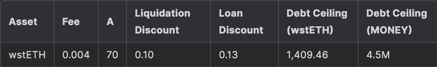Recommendation: We recommend continuing with the current parameter configuration for the $wstETH market, noting that it has been instantiated with our initial recommendations of fee: 0.2%, A: 72, liquidation_discount: 4%, loan_discount: 7%. The current debt ceiling of the $wstETH market is 500k MONEY. From a market risk perspective, it can be safely raised to 1M max debt.