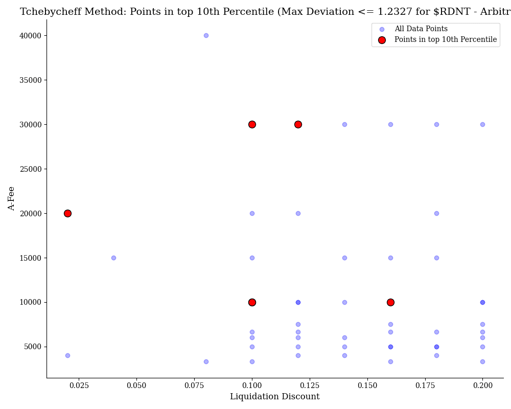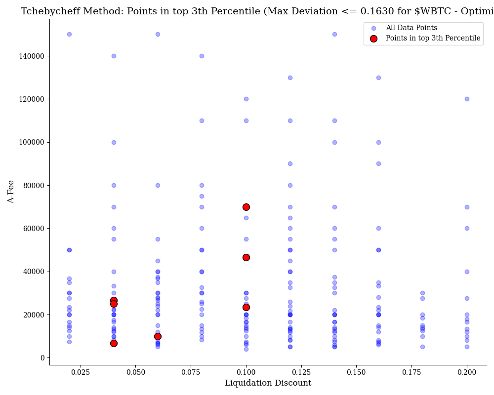 For $WBTC, the simulations output suggested minimal deviations in Tchbycheff method. A debt ceiling of 140.34 WBTC (8.5M MONEY) is recommended to manage slippage effectively.