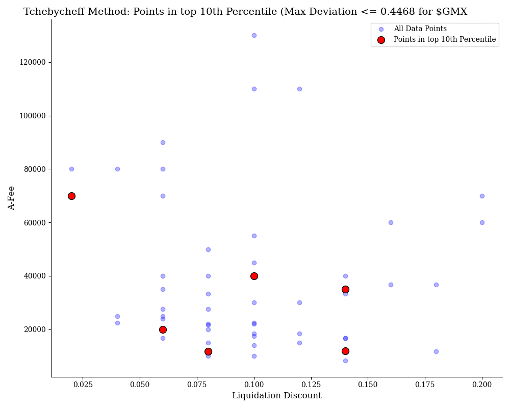 $GMX performed reliably, with well-distributed optimal points in the top 10th percentile of configurations. Liquidity analysis indicates that $GMX can manage moderately large swaps without significant slippage. A debt ceiling of 110,631.68 GMX (3M MONEY) is recommended to avoid excess price impact.