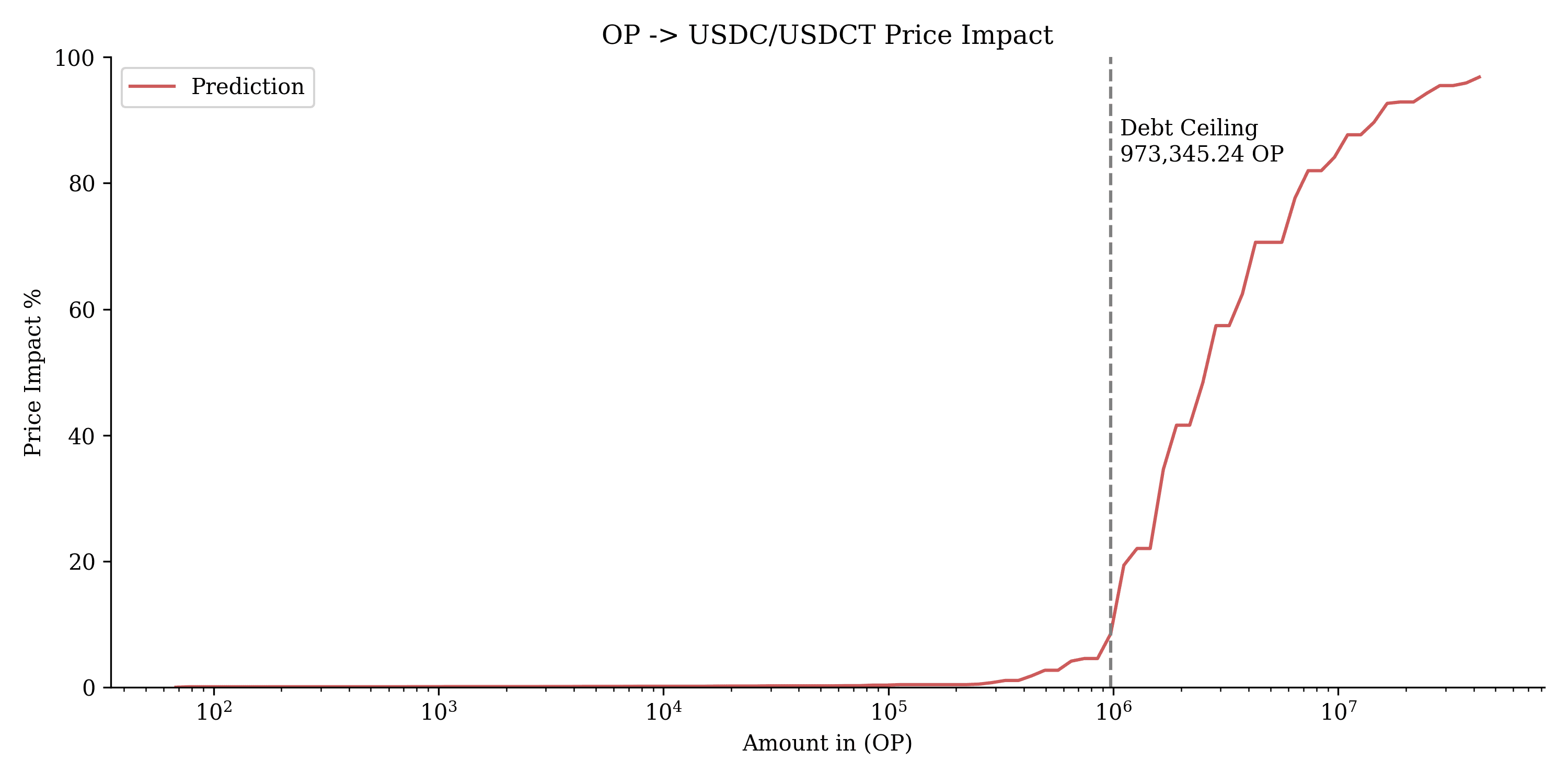 This chart illustrates the price impact of swapping $OP into USDC/USDT. The vertical dashed line marks the debt ceiling of 973,345.24 OP, beyond which price impact rises sharply, indicating increased slippage for larger swaps.
