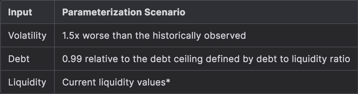 The simulation tool will allow us to make informed recommendations for market parameters based on the historical behaviors of each asset in adverse scenarios. These parameters stay constant during the life cycle of a market. Correctly selecting these parameters is essential to the overall health of a given market, and has repercussions for the protocol as a whole. Conversely, an improper choice of parameters adds friction to the liquidation mechanism and increases the risk of accumulating bad debt. Here is the list of market parameters that we will optimize for: