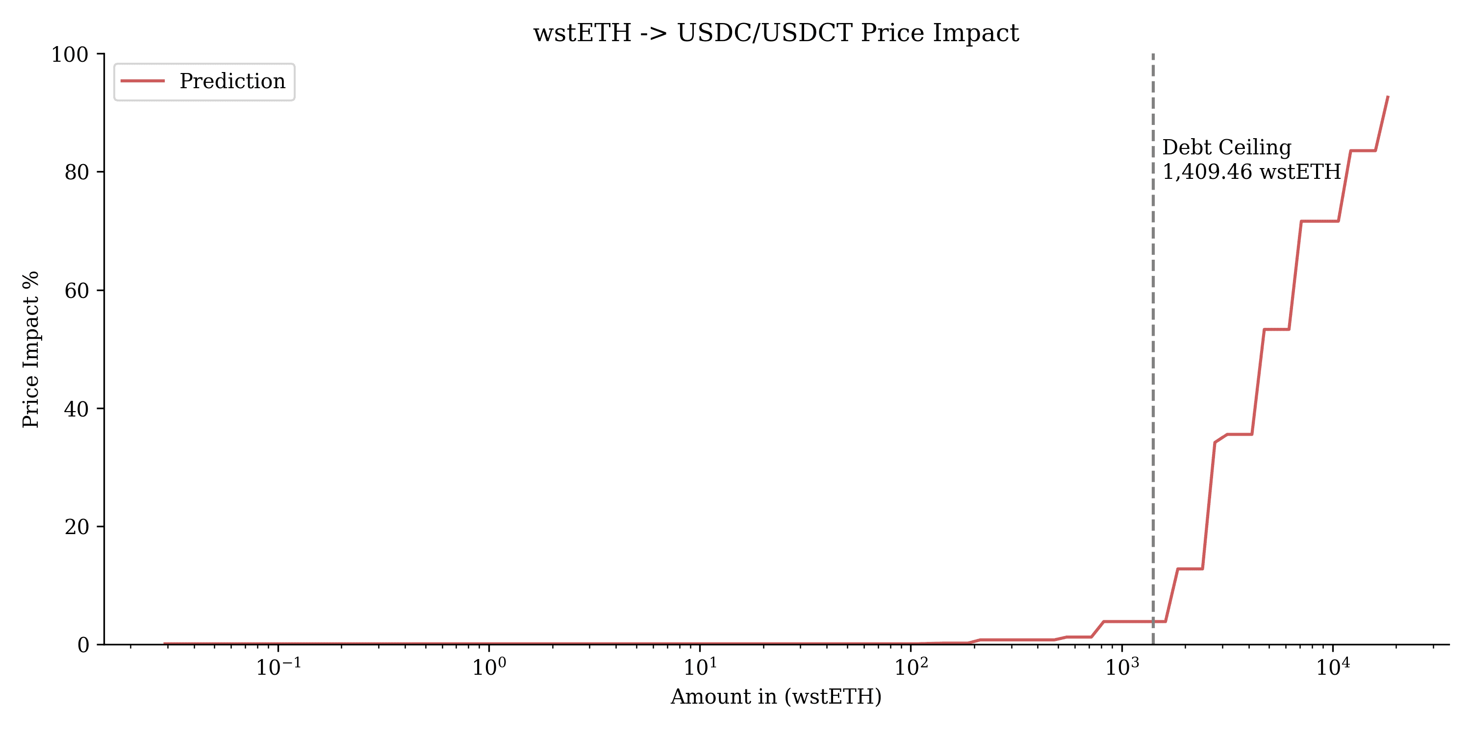 This chart shows the price impact of swapping $wstETH into USDC/USDT. The debt ceiling is set at 1,409.46 wstETH, beyond which the price impact rises sharply, indicating significant slippage for swaps exceeding this amount.