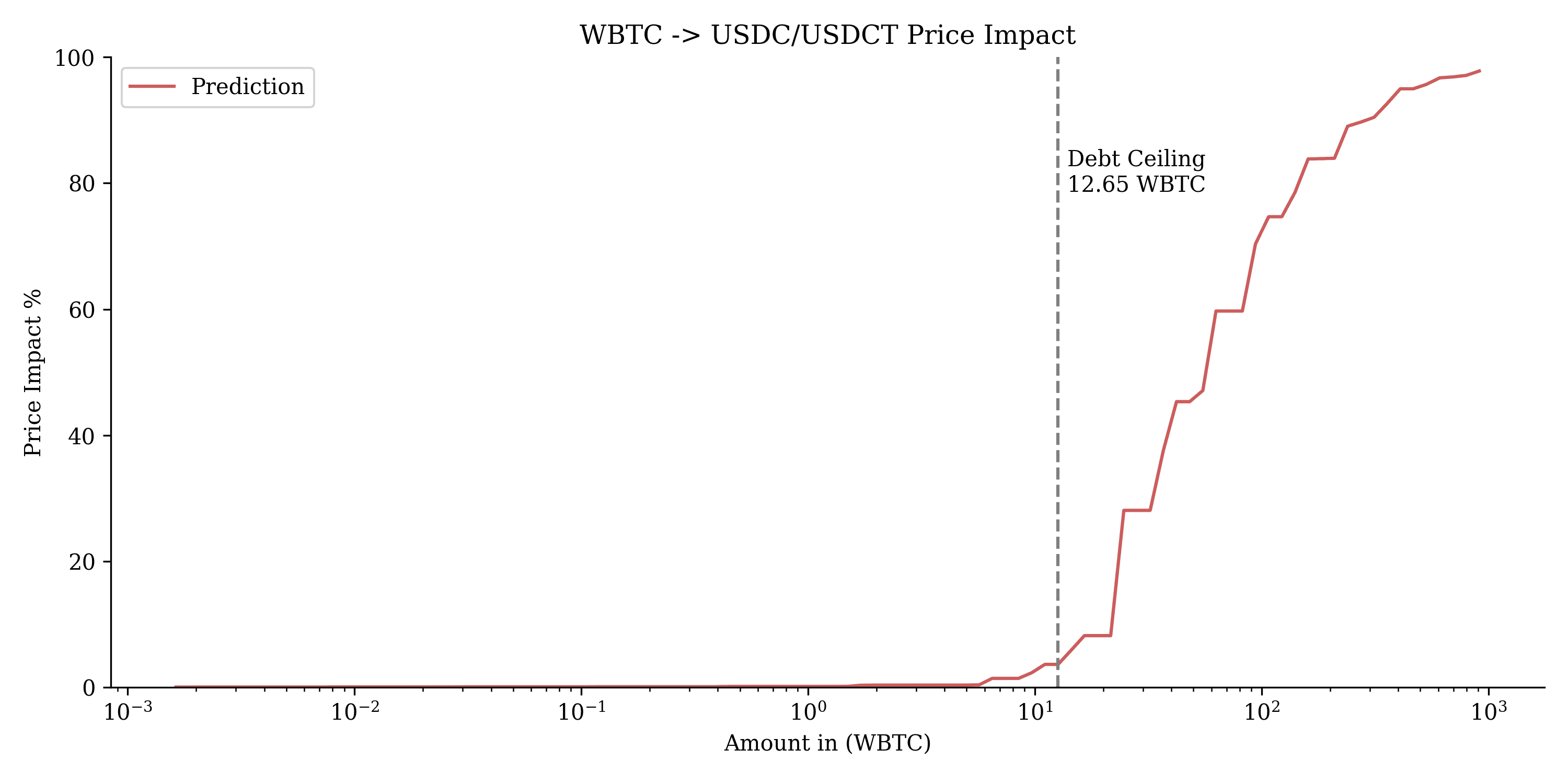 This chart depicts the price impact of swapping $WBTC into USDC/USDT. The debt ceiling is marked at 12.65 WBTC, after which the price impact rises sharply, indicating increased slippage for larger swaps beyond this threshold.