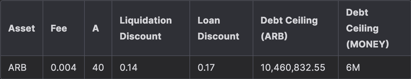 Recommendation: We recommend maintaining the current parameter configuration for the $ARB market, noting that it has been instantiated with our initial recommendations of fee: 0.15%, A: 30, liquidation_discount: 9%, loan_discount: 12%. The current debt ceiling of the $ARB market is 200K MONEY. From a market risk perspective, it can be safely raised to 6M max debt.