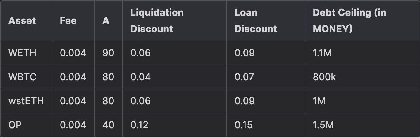 $wstETH on Optimism performed well with a balanced trade-off between risk and reward, supported by adequate liquidity to manage moderately large swaps. The optimization results suggest that it can continue to perform with minimal bad debt risk. A debt ceiling of 319.88 wstETH (1M MONEY) is recommended to keep swaps within manageable price impact.