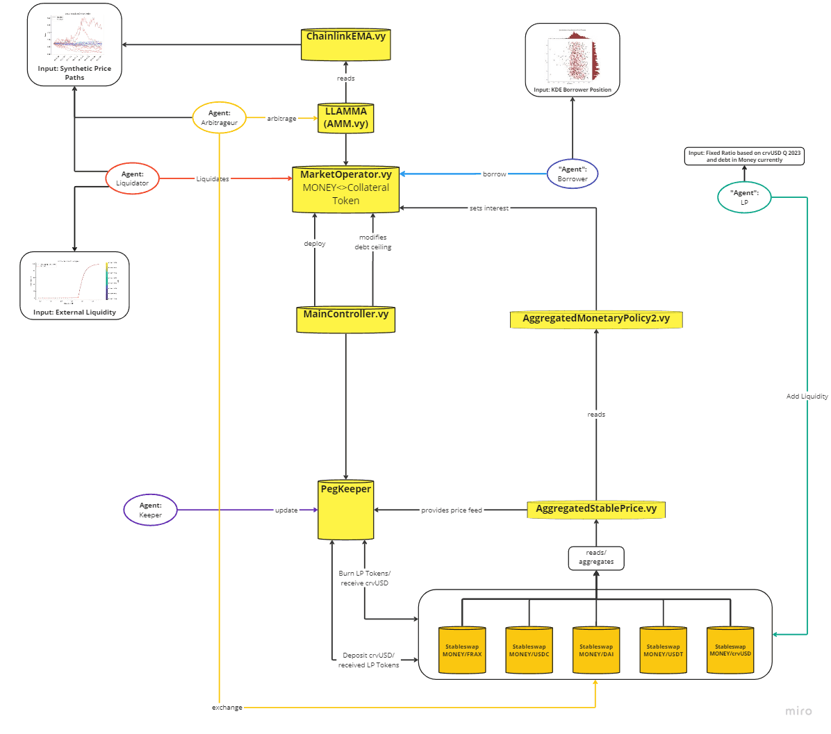 To model the system smart contracts, we rely on curvesim and crvUSDsim. Both packages offer Python classes for interacting with Curve smart contracts. For instance, we can simulate the precise impact of an arbitrageur’s trade on MONEY prices by modeling the underlying LLAMMA pool directly. We have also modified the crvUSDrisk package as a foundation for generating parameterizations for existing markets.