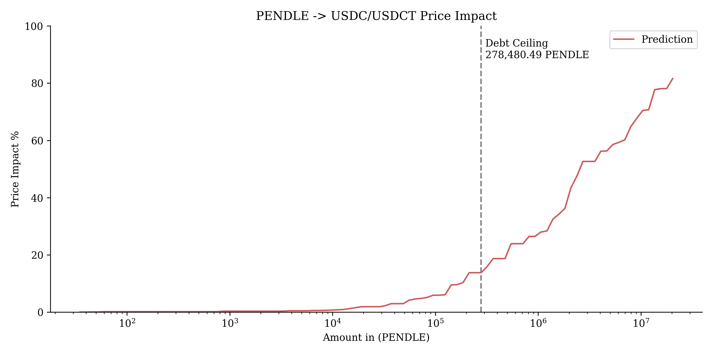 This chart shows the price impact of swapping $PENDLE into USDC/USDT. The debt ceiling is marked at 278,480.49 PENDLE, beyond which price impact increases significantly, leading to greater slippage for larger swaps.