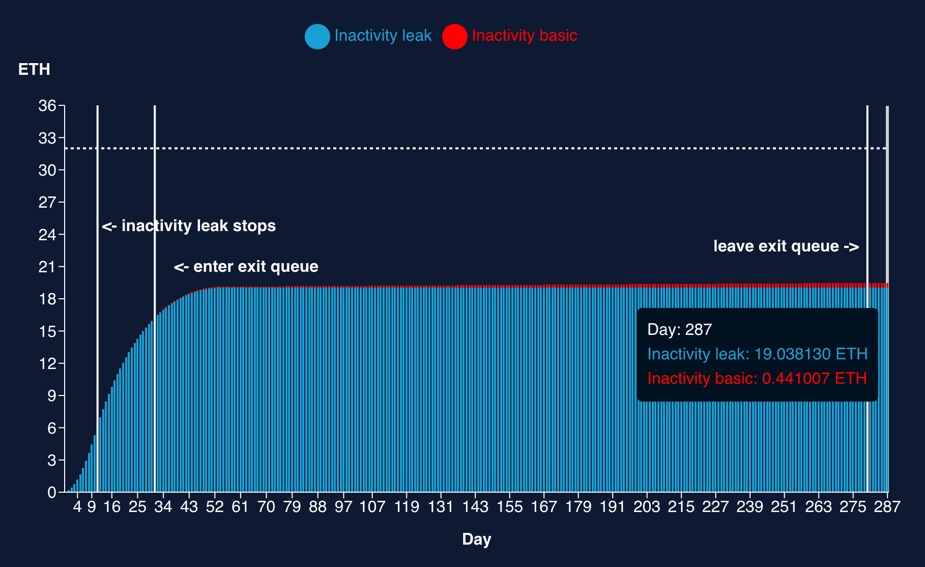 Because validators with a balance lower than 16 ETH are automatically exited from the Ethereum consensus, a high enough percentage of inactive validators can trigger a massive exit of inactive validators from the consensus, which would result in a very long exit queue.