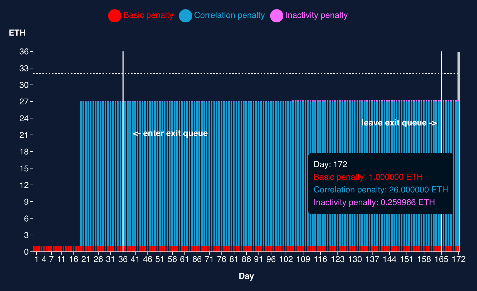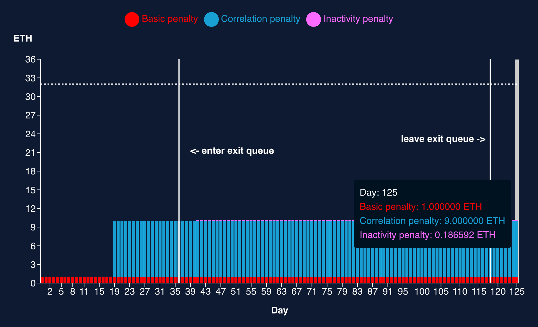 18 days later, a second penalty comes into play: the correlation penalty. Its scale depends on the total share of validators slashed in a 36-day window surrounding the slashing event. It will reach a maximum of 31 ETH when more than 1/3 of all active validators are slashed during that period. Together with the basic slashing penalty of 1 ETH, this would result in a 100% loss for the staker.