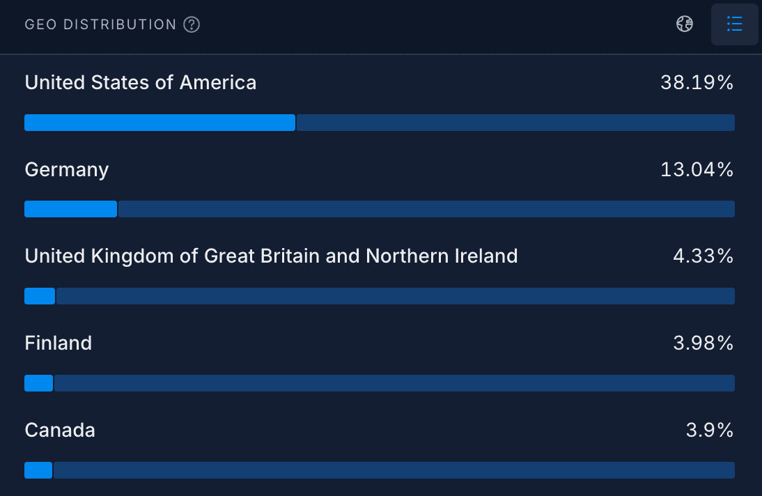 If we look at the geographical distribution of nodes, we can see that 38.19% of all validators operate from the United States of America. This is above the critical 1/3 finality threshold and could result in the inactivity leak being activated for all validators operated from there.
